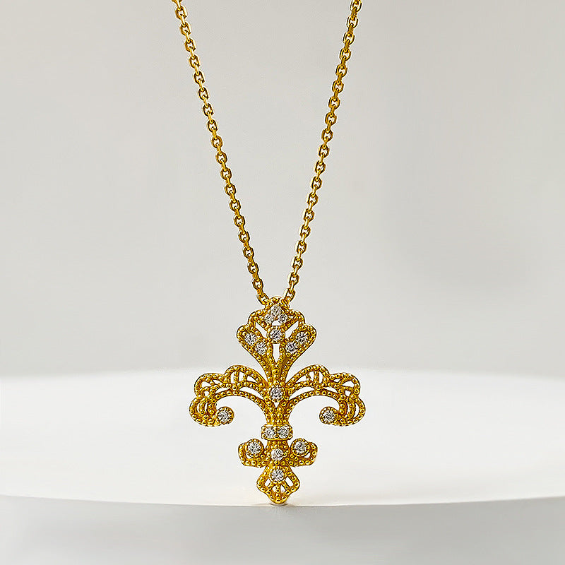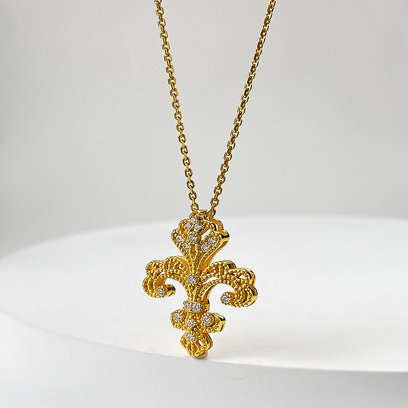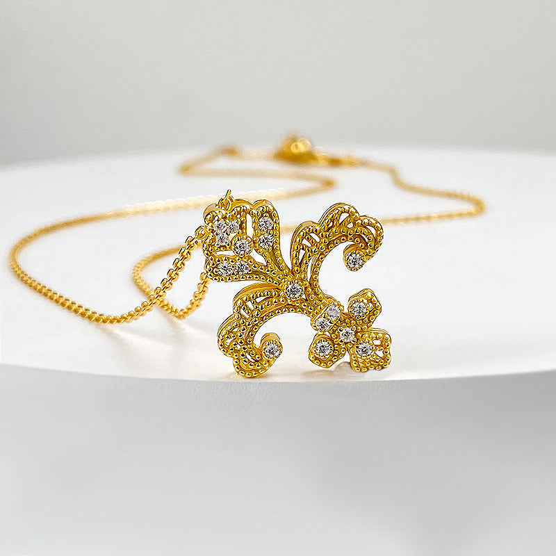 This vintage-inspired necklace features a magnificent fleur-de-lis pendant, symbolizing nobility and grace. Crafted in sterling silver and plated in radiant gold, the intricate detailing is highlighted by sparkling cubic zirconia accents, capturing the elegance of European baroque design.