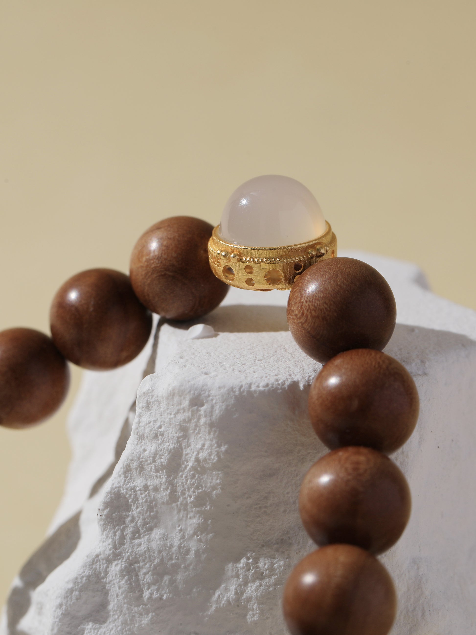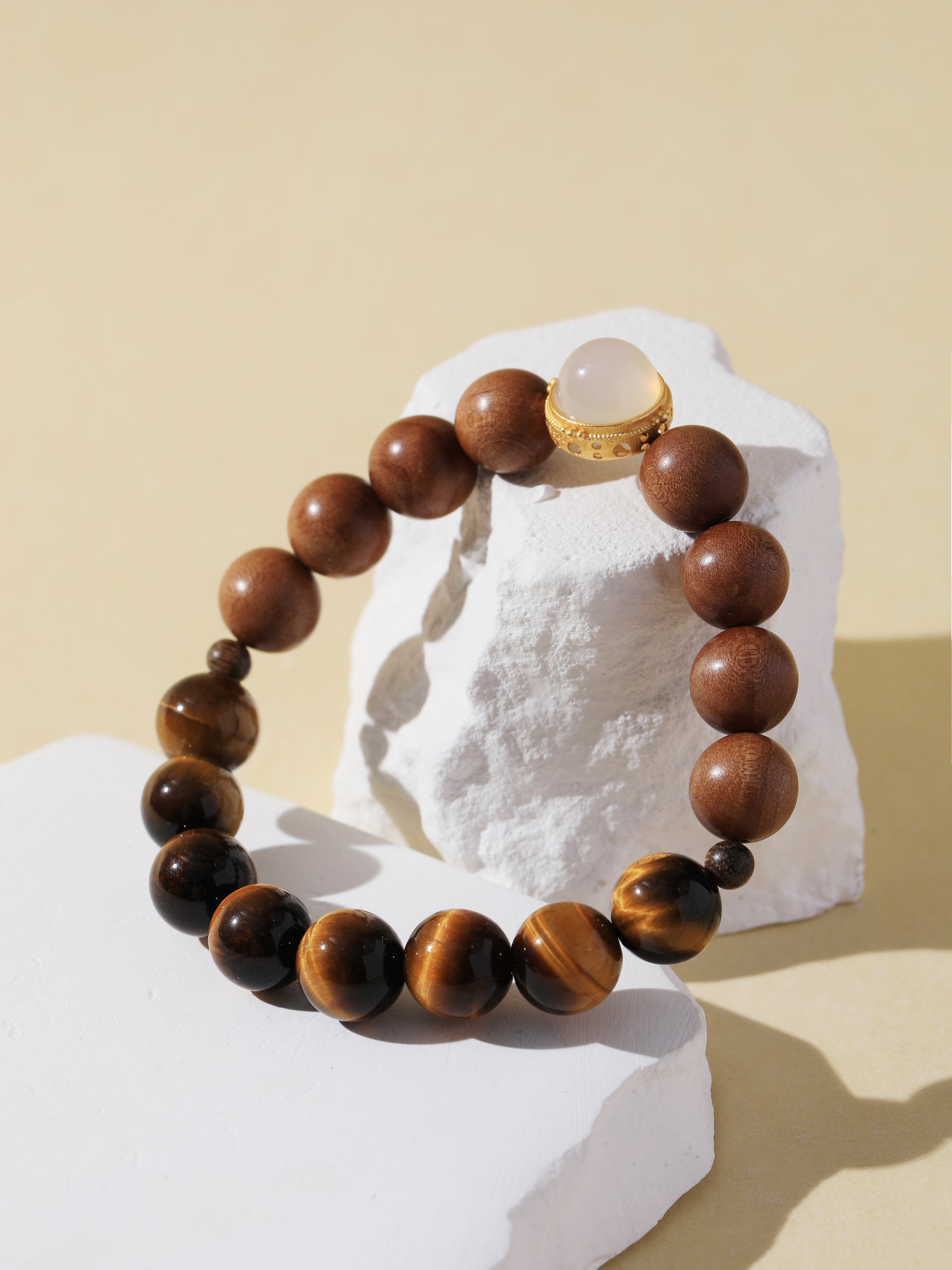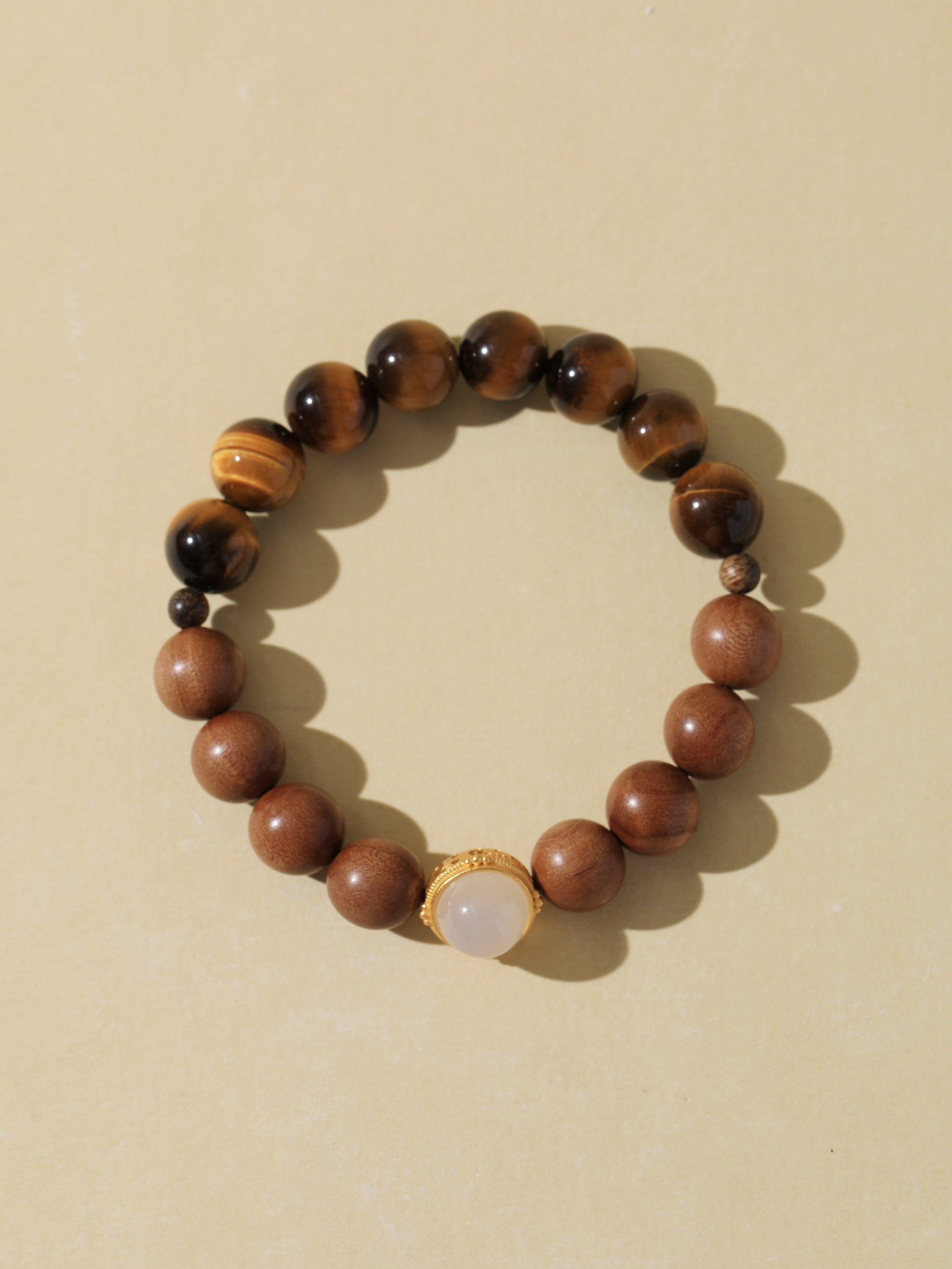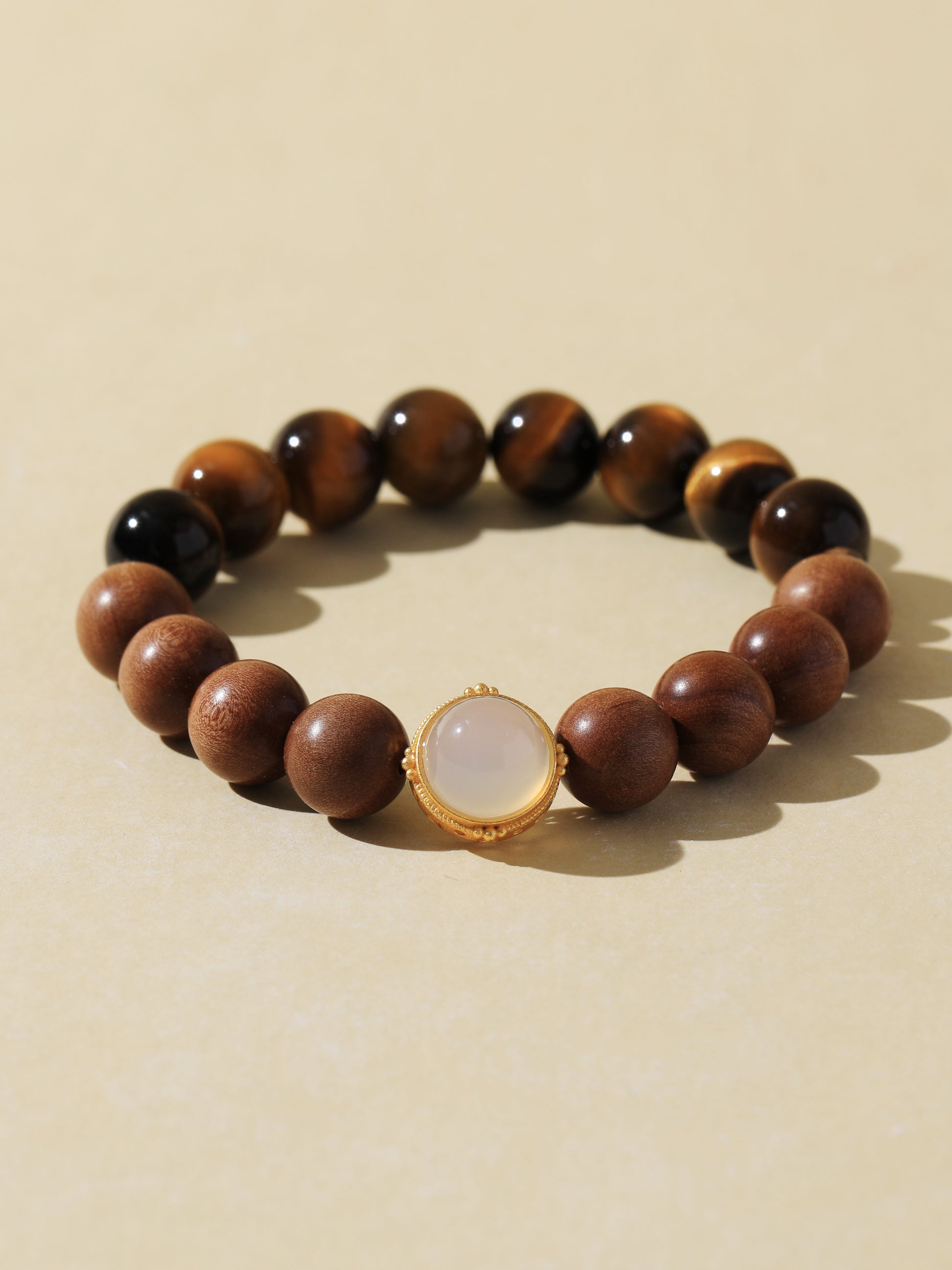 Black Tiger’s Eye is a powerful protective stone that enhances courage, decisiveness, and mental clarity—especially under pressure. It's grounding energy builds strength from within. Sandalwood is revered for its calming and purifying properties, perfect for centering the mind and supporting meditation. White Chalcedony, framed in gold, adds a touch of soft illumination.