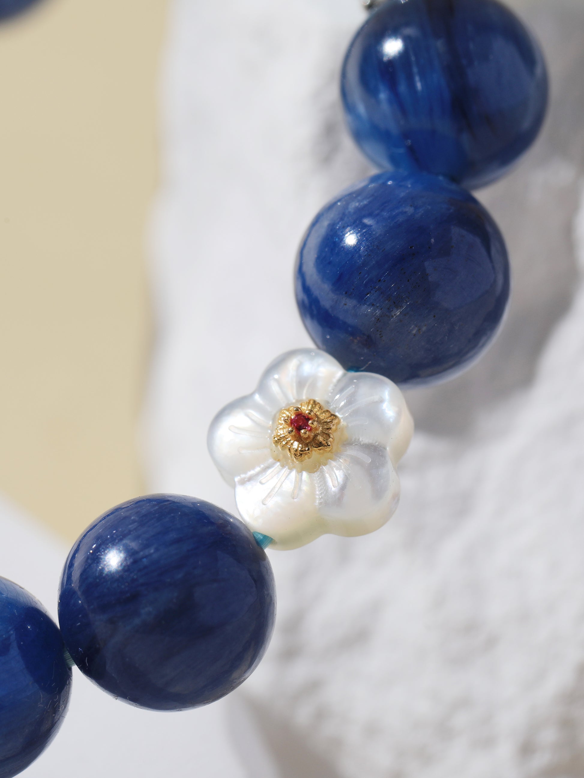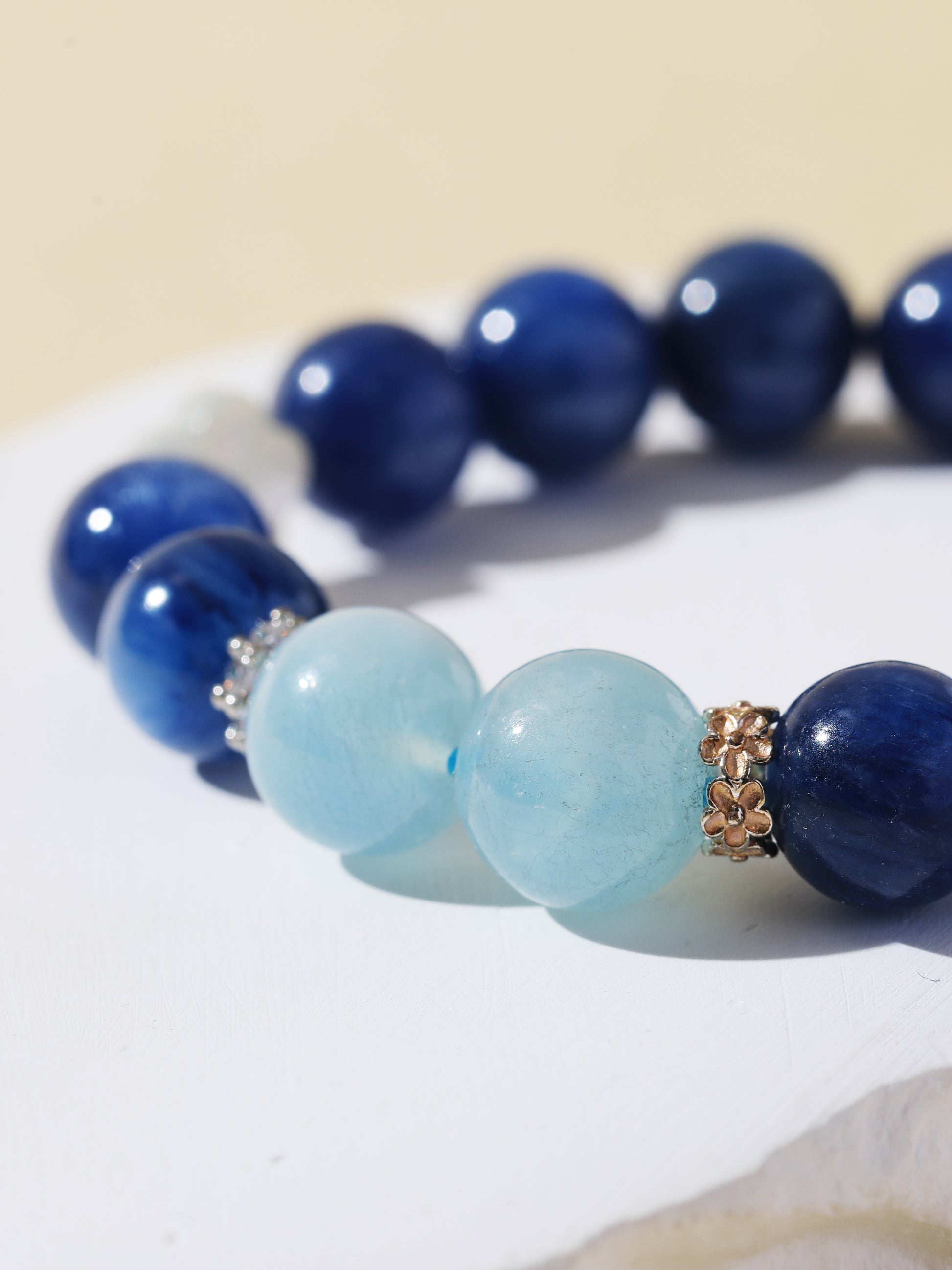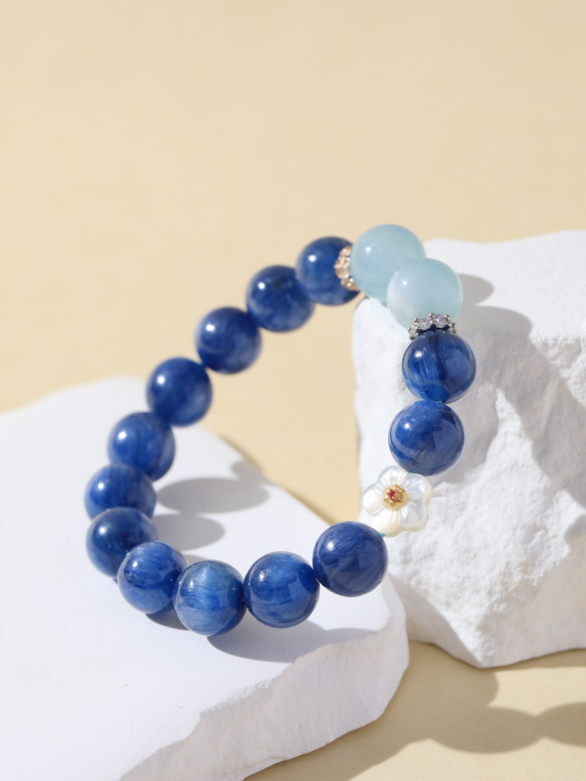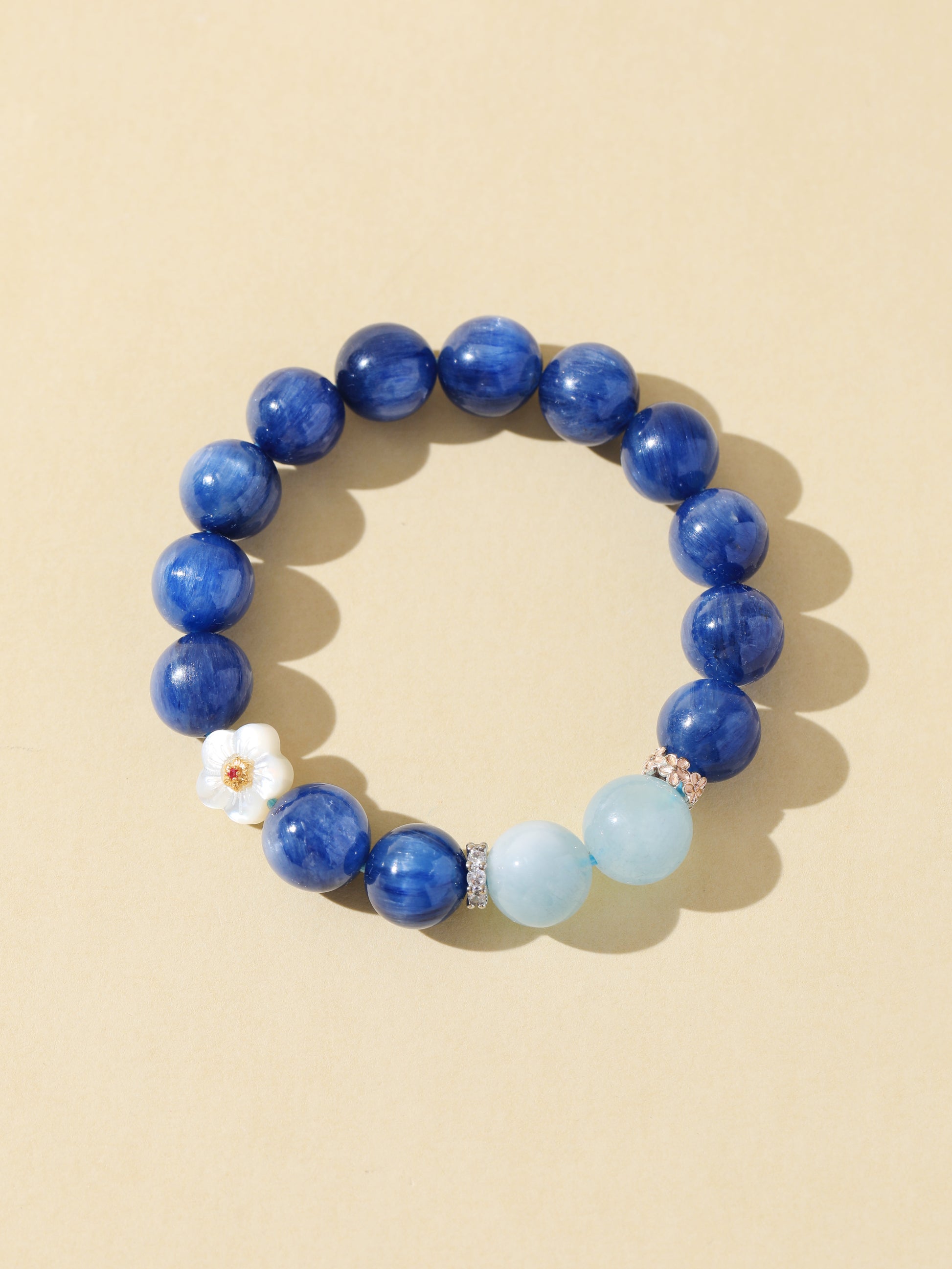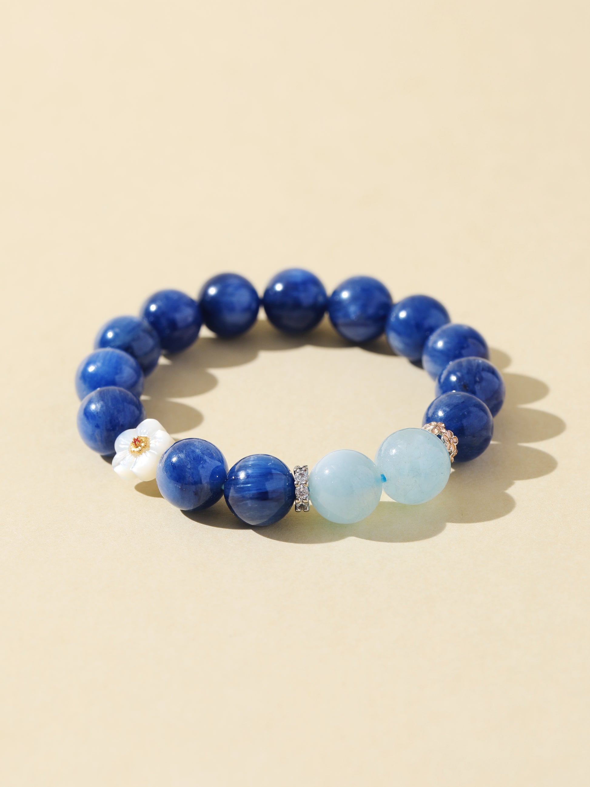 Kyanite is known for aligning chakras and clearing energy blockages, promoting clarity and focus. Blue Moonstone enhances intuition and soothes emotional turbulence. This bracelet features 10mm cat’s eye kyanite and 11mm blue moonstone beads, accented with a delicate white flower charm and sparkling silver-tone copper spacers. A harmonious blend of deep serenity and subtle glow.
