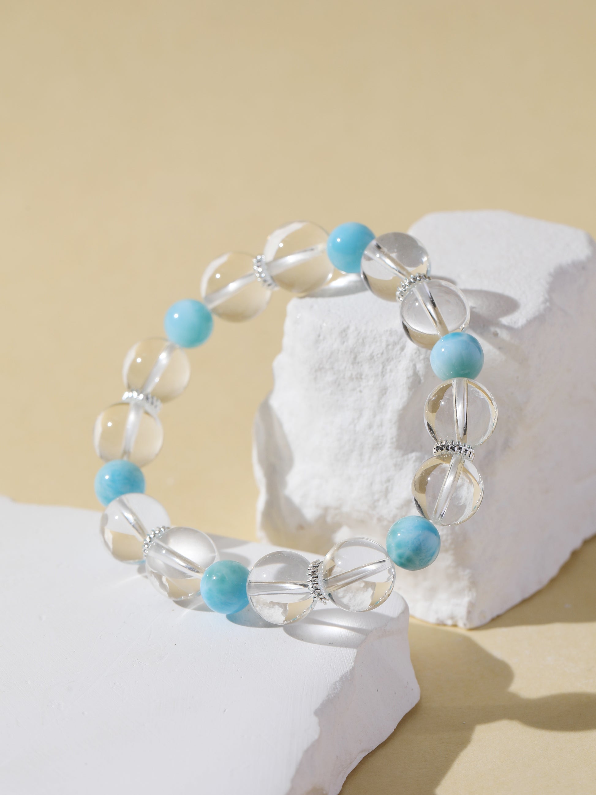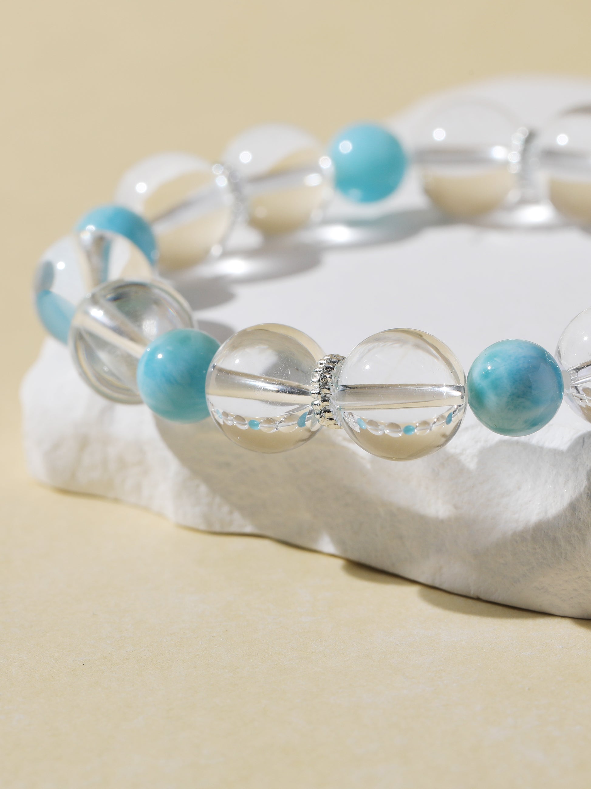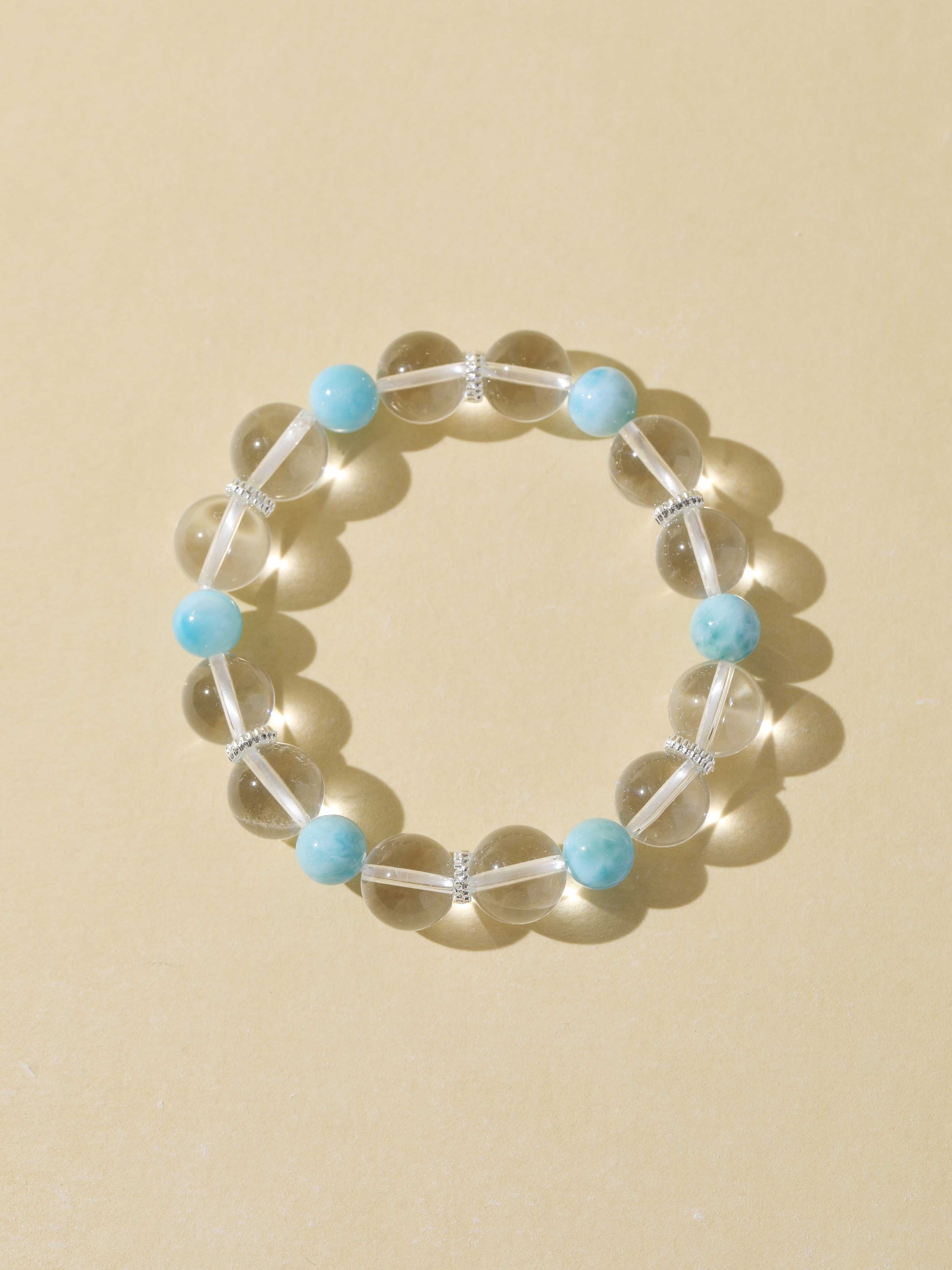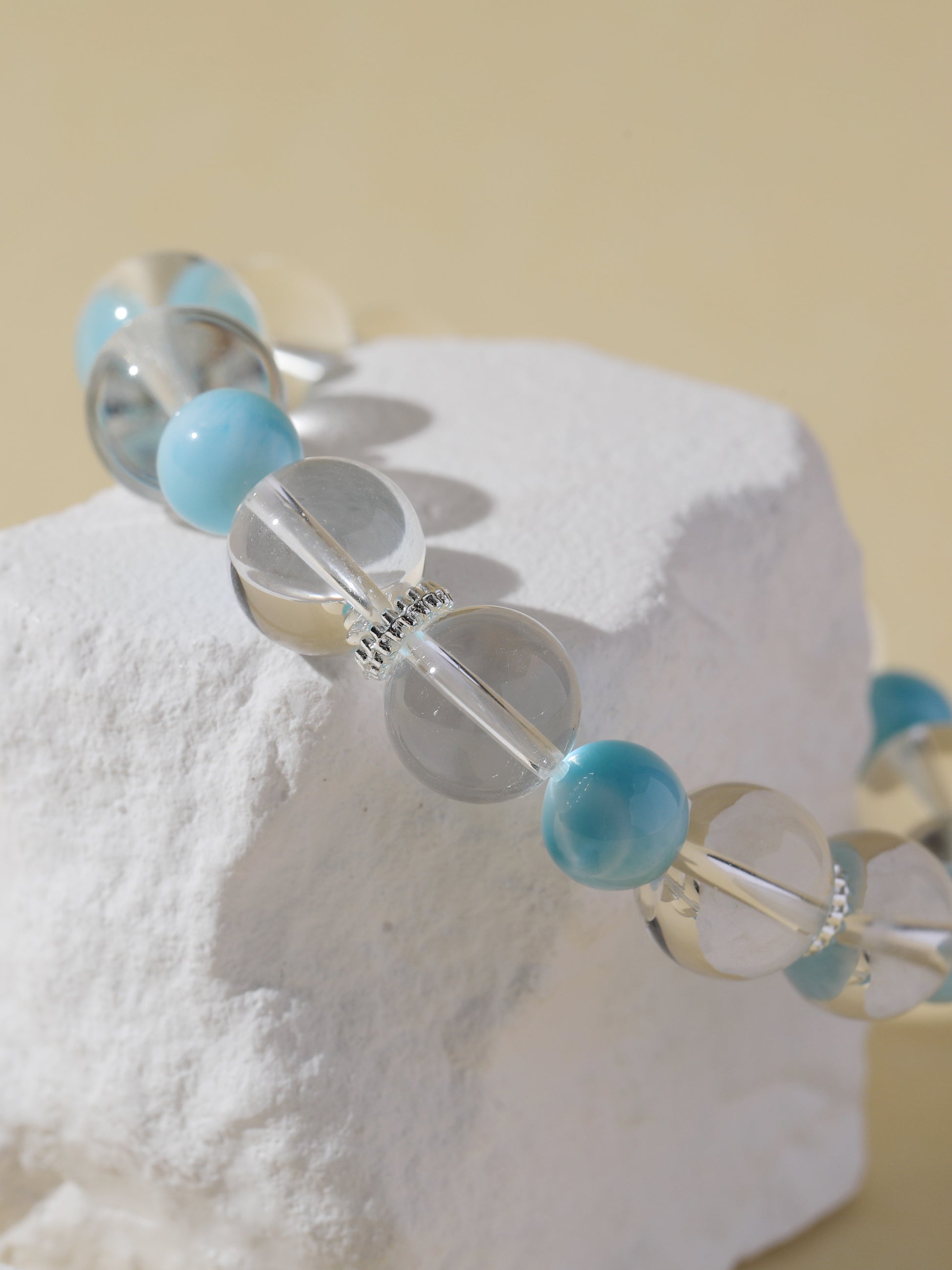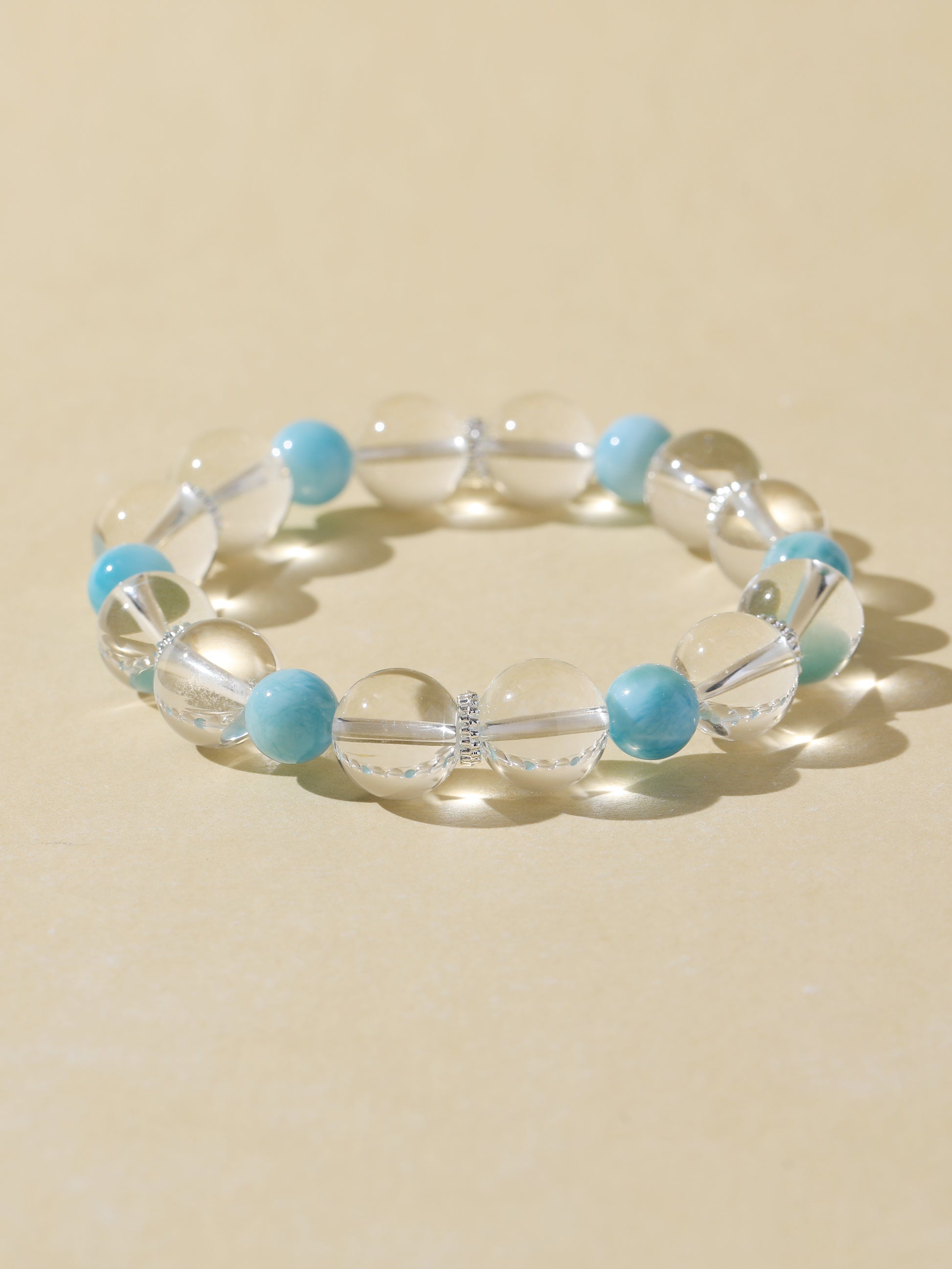 Clear Quartz is the "Master Healer"—it amplifies energy, clears mental fog, and heightens spiritual focus. Larimar is a rare stone of tranquility and self-expression, soothing emotional waves and reconnecting you with inner peace. This bracelet combines 10mm Clear Quartz with 7.5mm Larimar beads and silver-toned accents, offering a clean, luminous aesthetic.