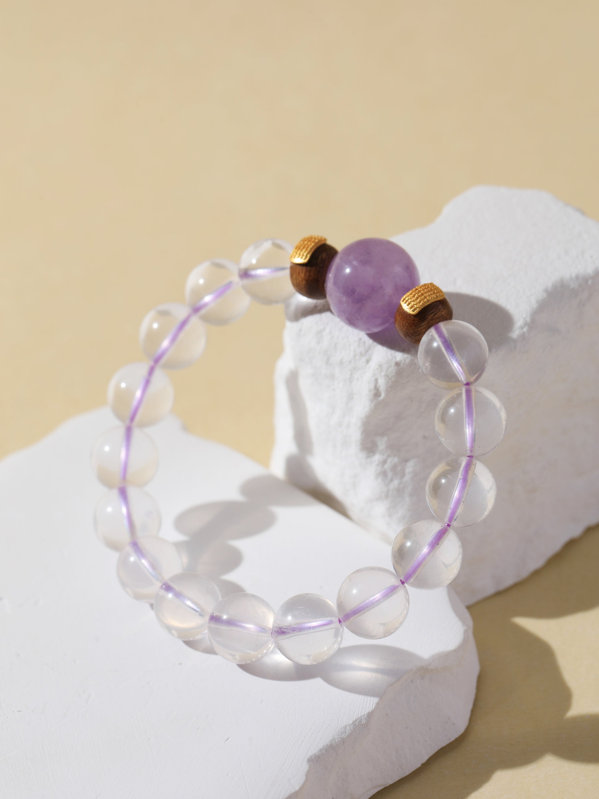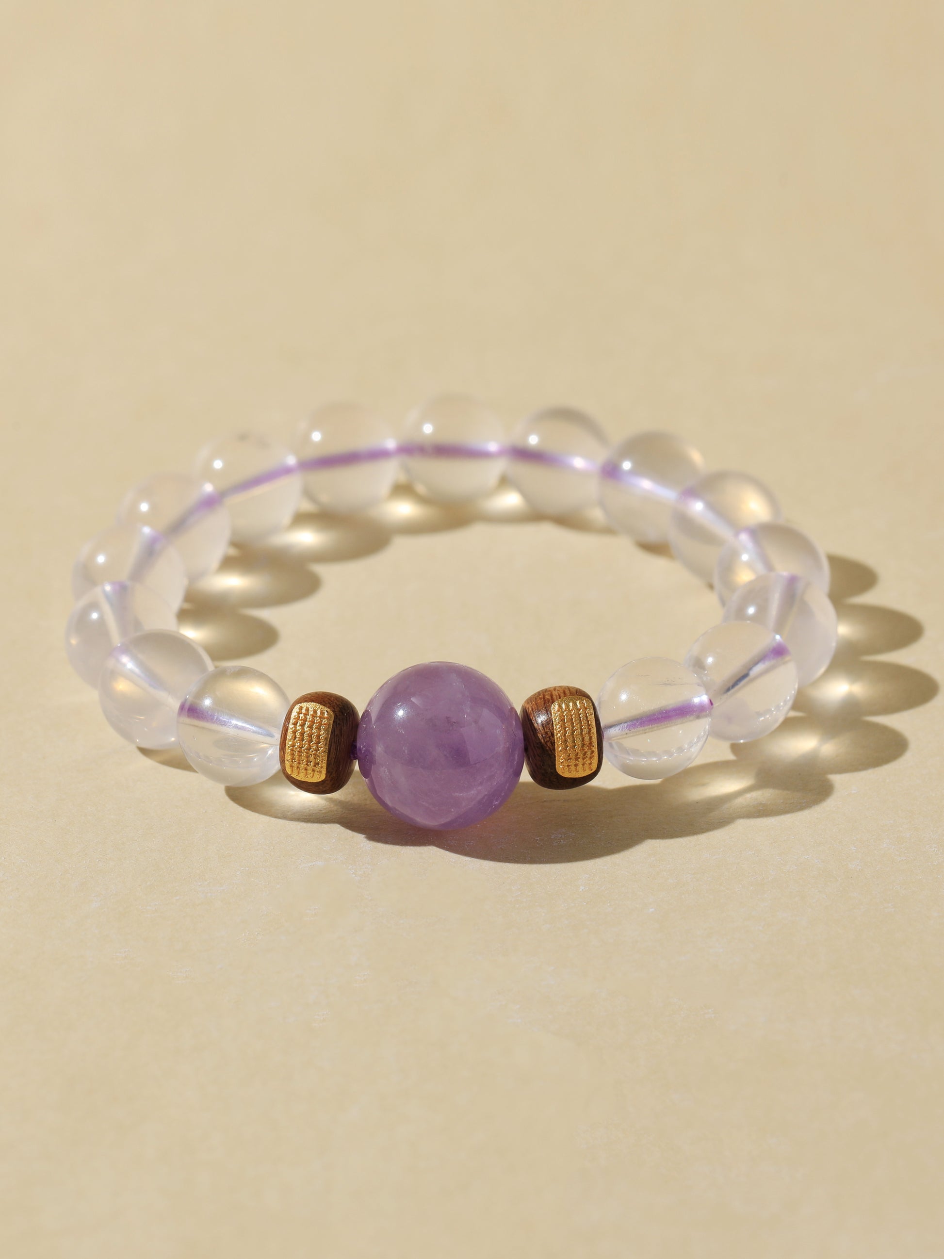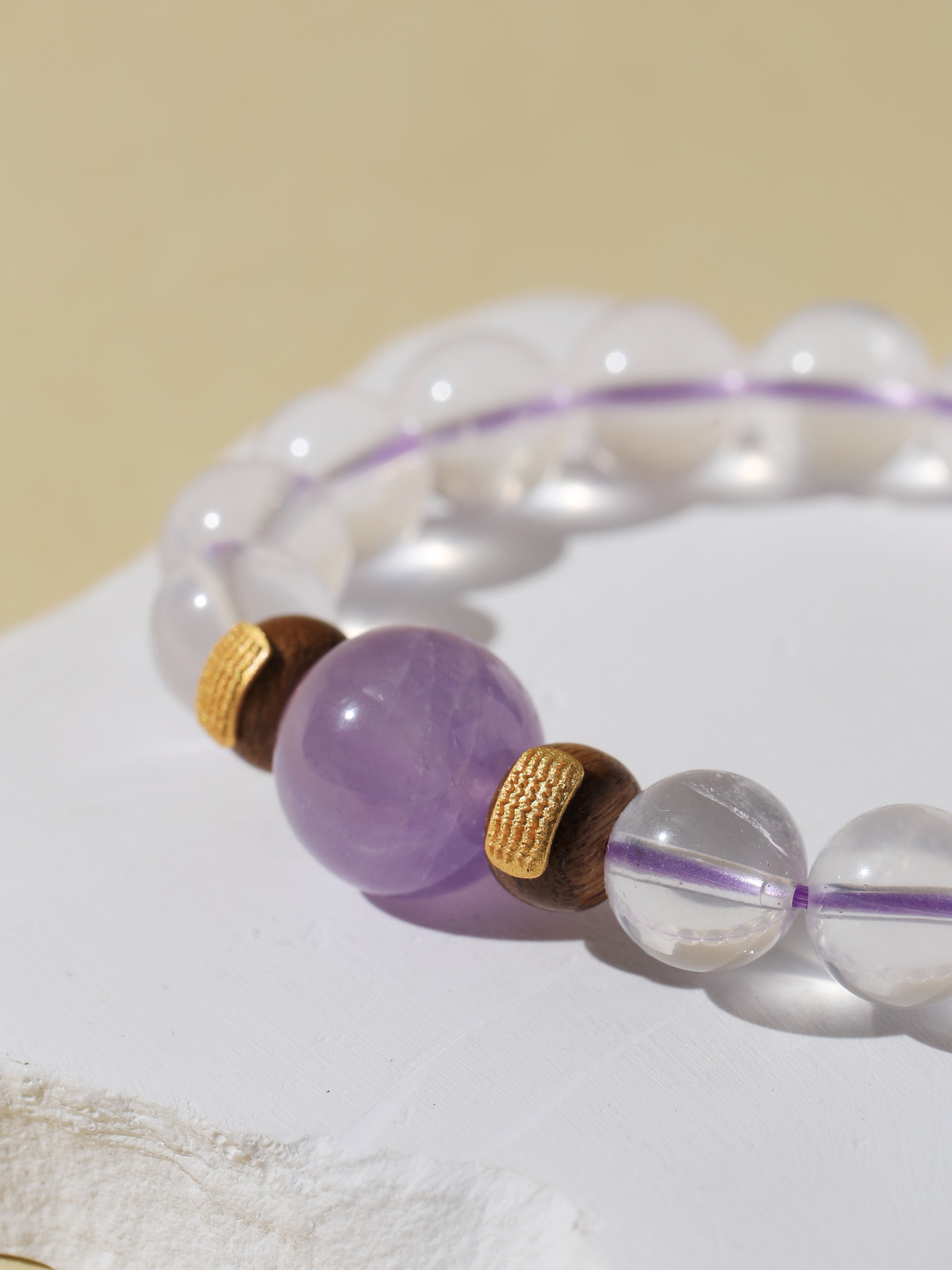 Clear Quartz is the ultimate energy amplifier, known for aura cleansing and clarity of thought. Purple Rabbit Hair awakens inner vision and emotional calm, with its hair-like inclusions symbolizing flowing inspiration and spiritual sensitivity. Agarwood, long revered in Eastern traditions, calms the spirit and stabilizes energy—serving as a sacred bridge between grounding and higher awareness.