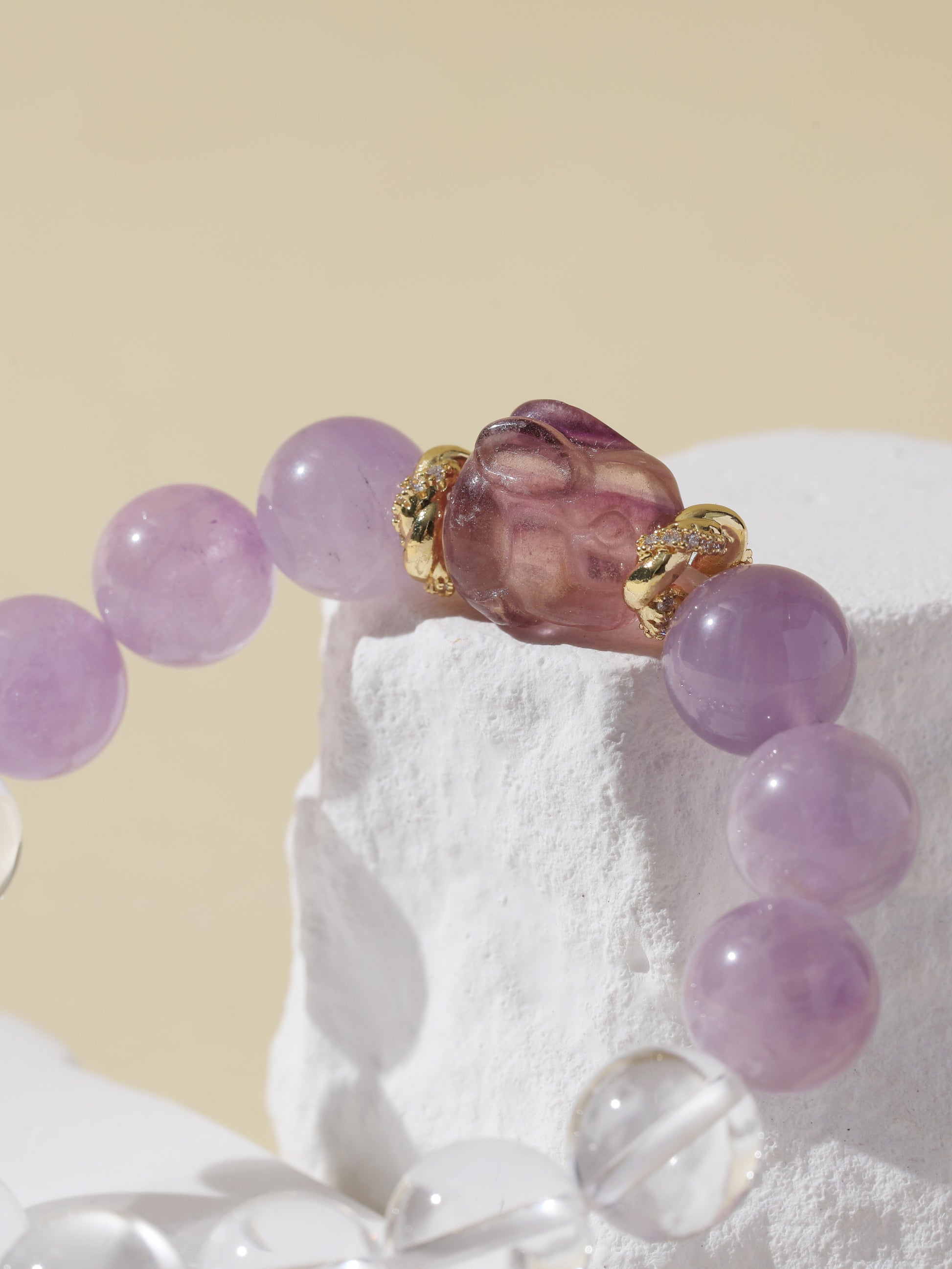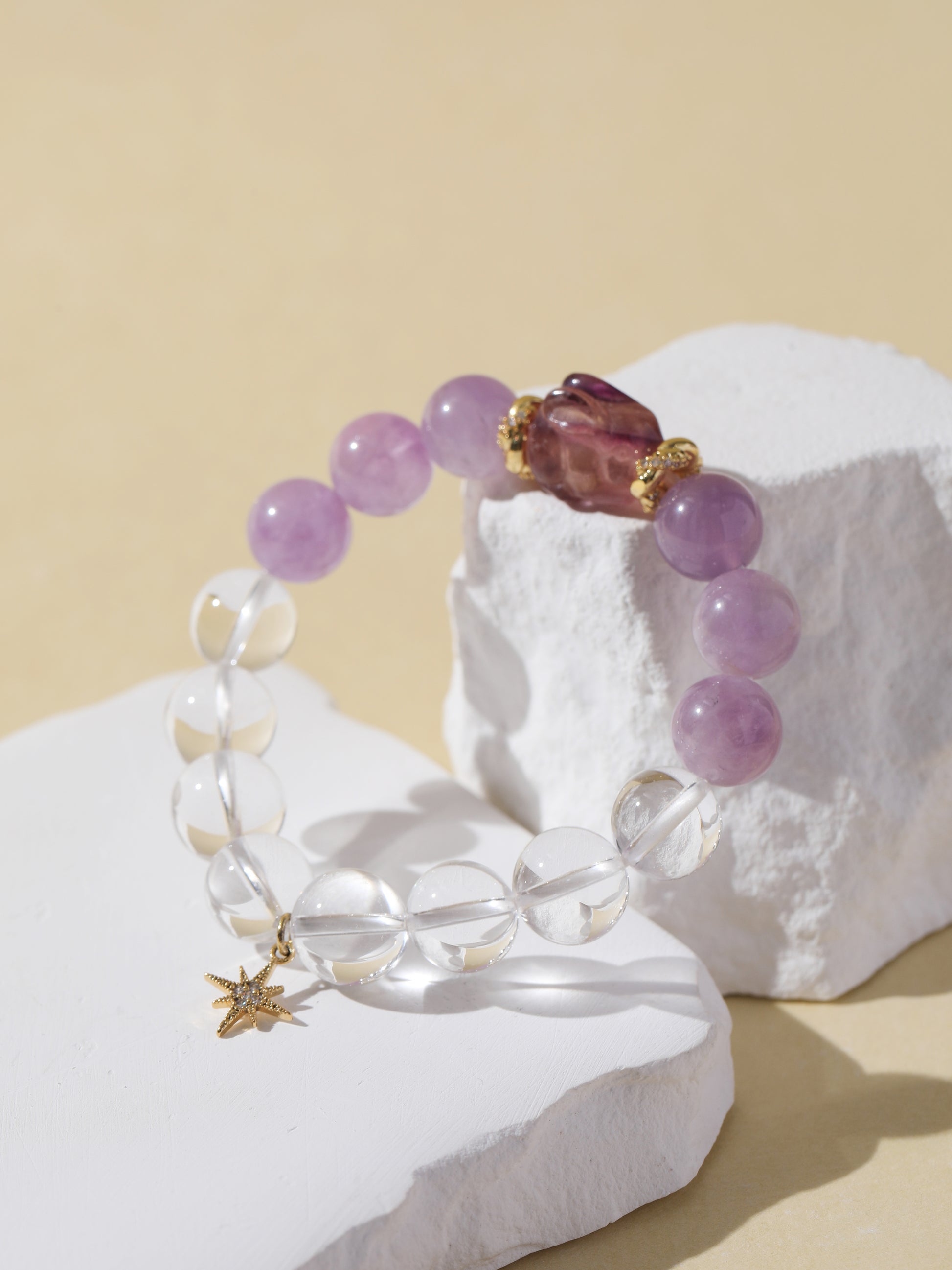 Clear Quartz is a master healer, amplifying energy, purifying the aura, and sharpening mental focus. Purple Rabbit Hair Quartz carries soft, high-frequency energy that calms emotions and enhances inner clarity. This bracelet accents with a hand-carved Fluorite bunny and a golden star charm. With its soft glow and whimsical energy, it blends clarity and intuition with protection and playfulness.