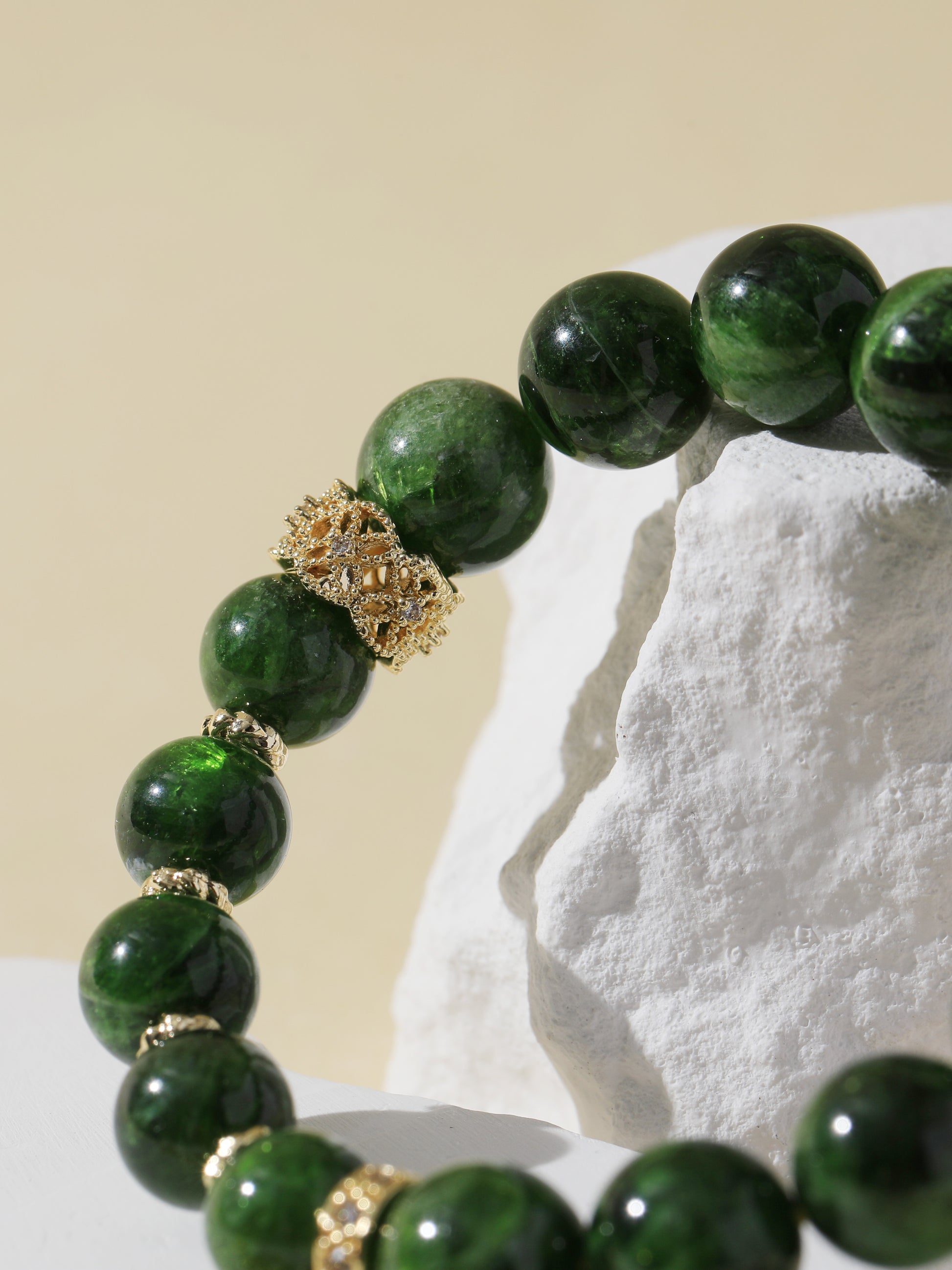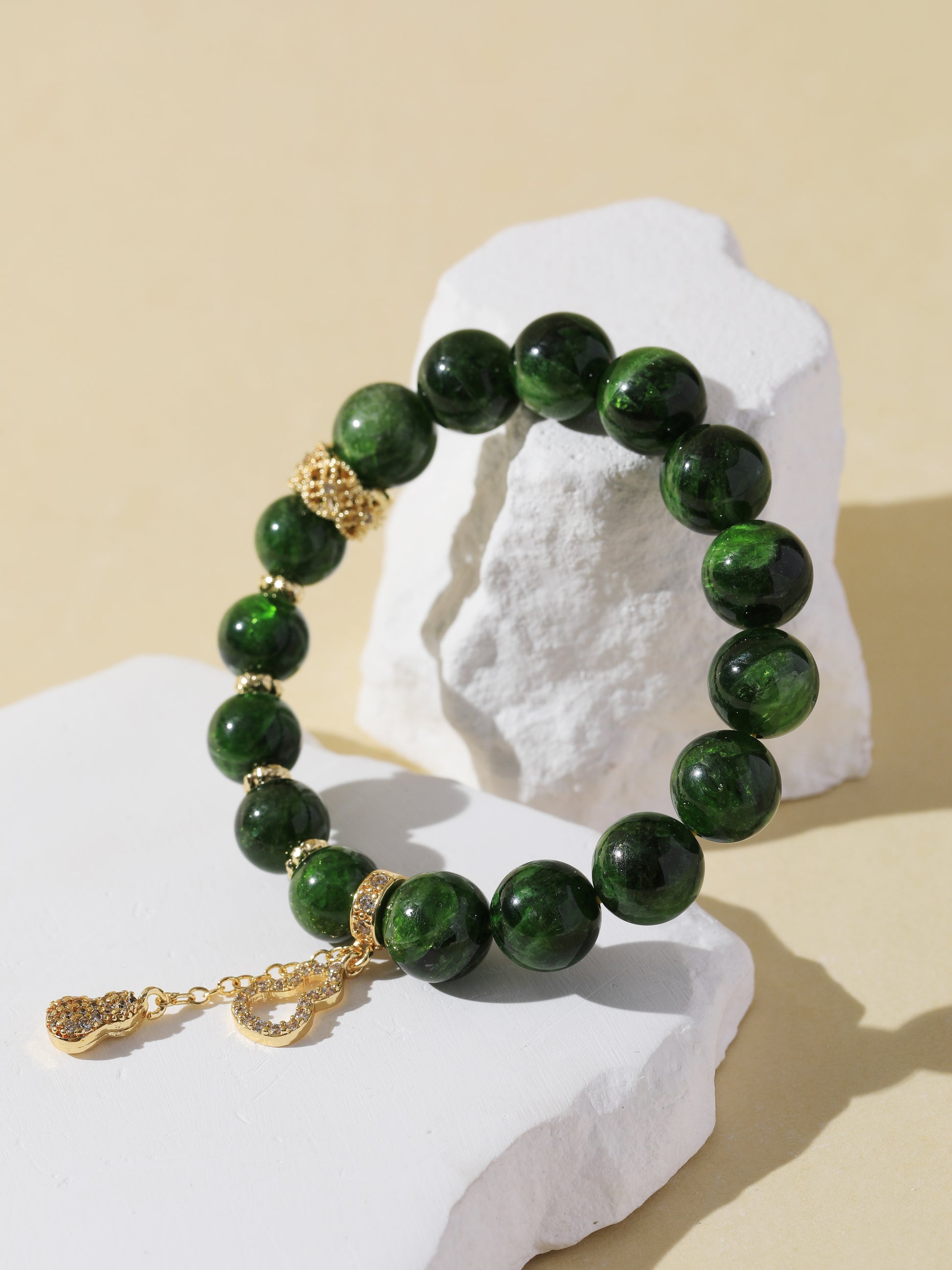 Diopside is a grounding stone rich in Earth energy—it promotes emotional stability, revitalizes the body and mind, and strengthens inner resilience. The gold gourd charm, a traditional Eastern symbol of fortune and protection, amplifies this bracelet’s intent to safeguard and empower.
