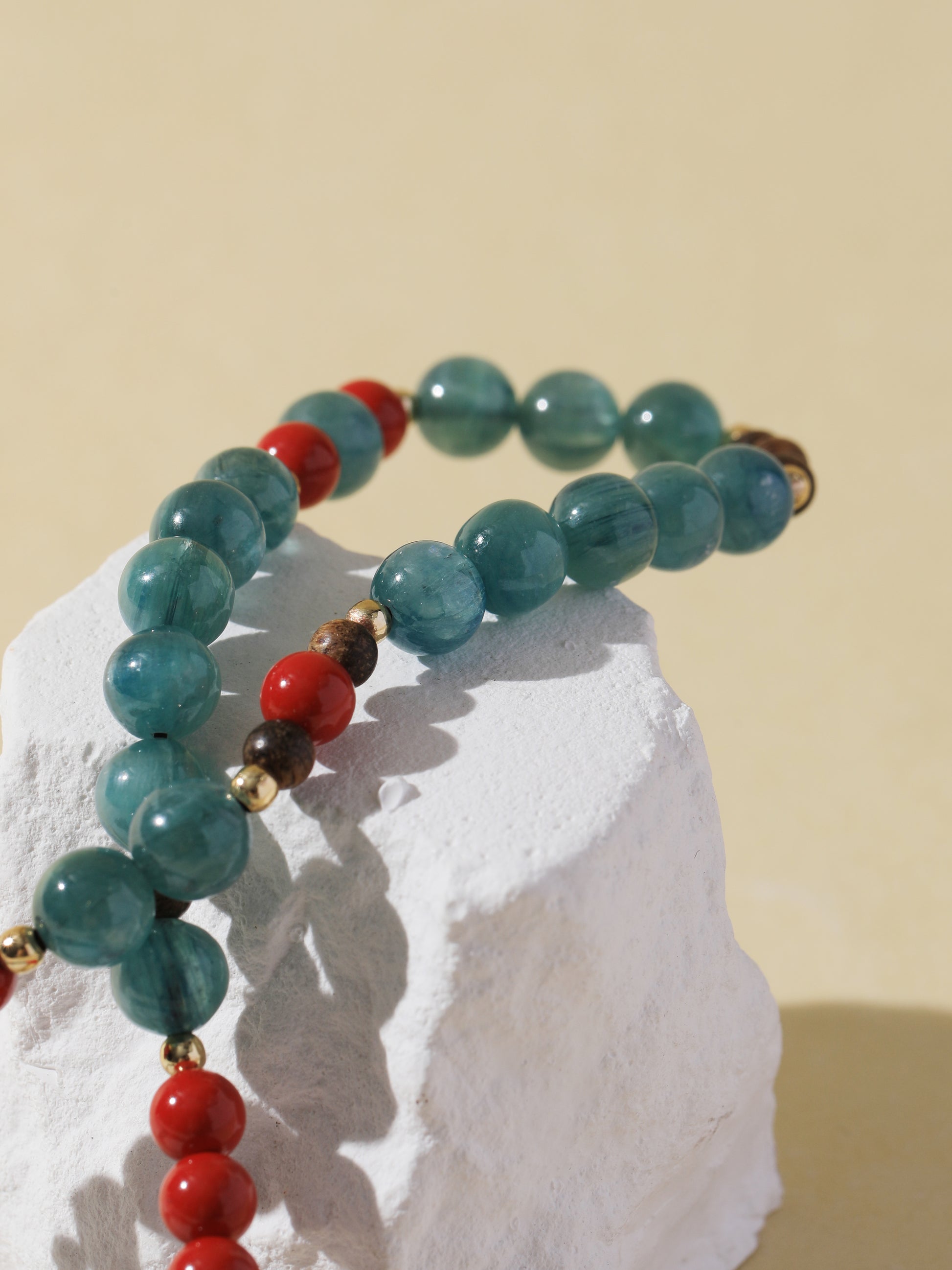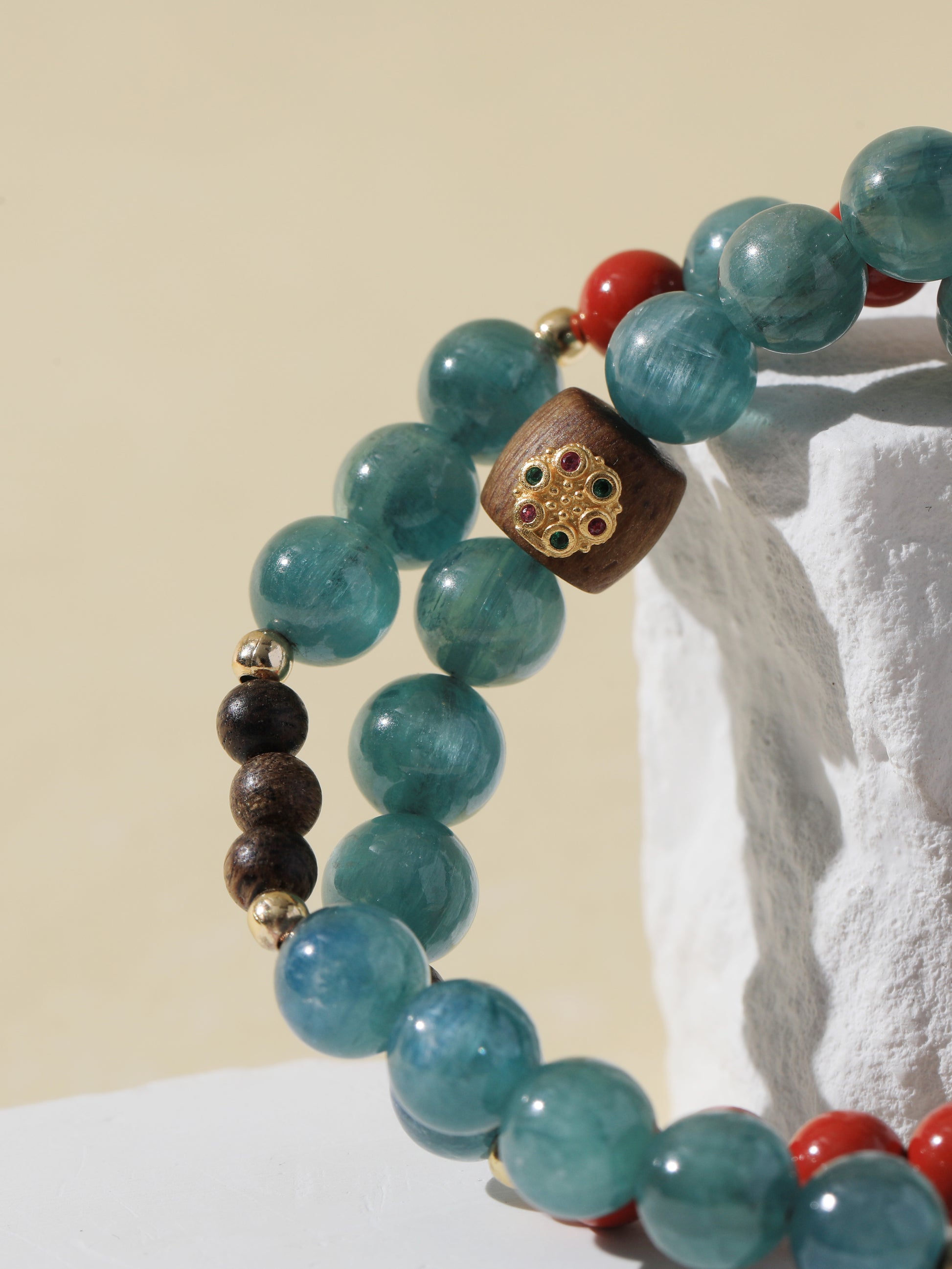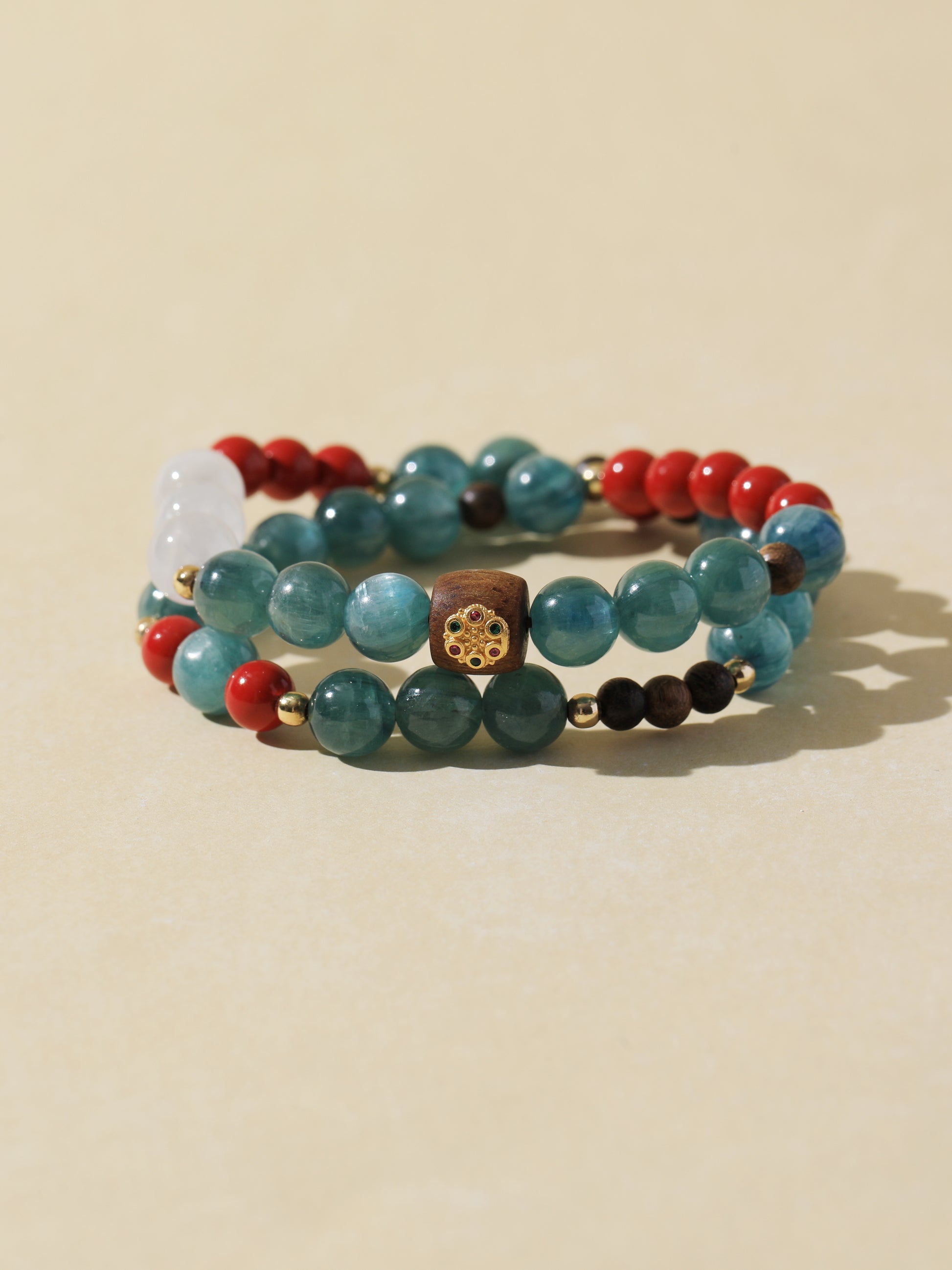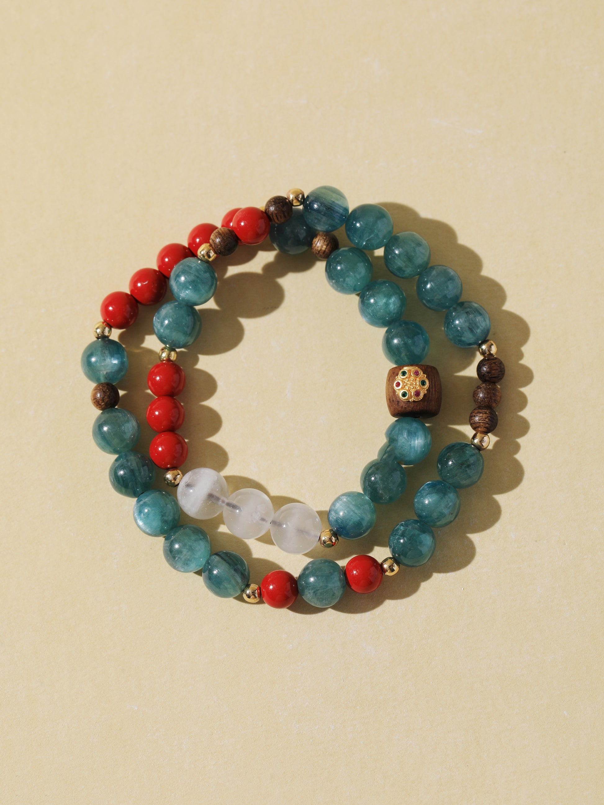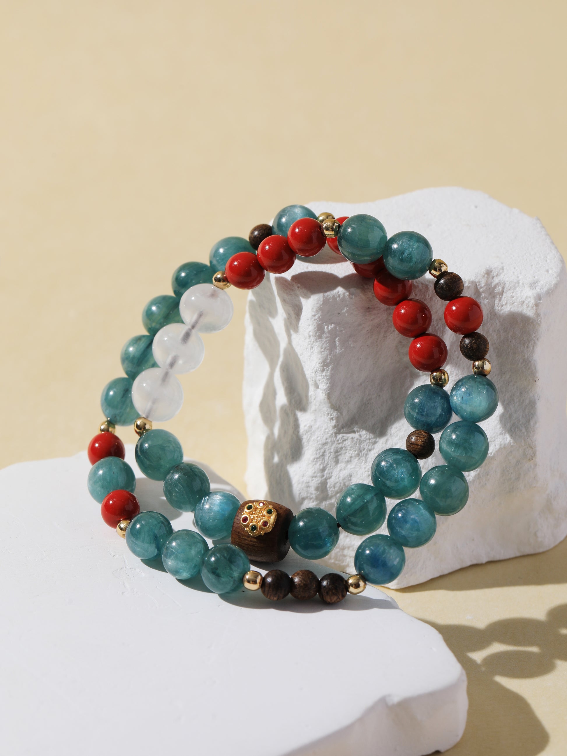 Blue-Green Quartz brings clarity and fresh perspective, while Cinnabar infuses the spirit with protective vitality. White Cat’s Eye enhances intuition and mental focus. This vibrant design features a harmonious color blend, accented with a natural agarwood bead that offers a subtle woody aroma. The double-wrap style allows for versatile wear—whether as a bracelet or a necklace.