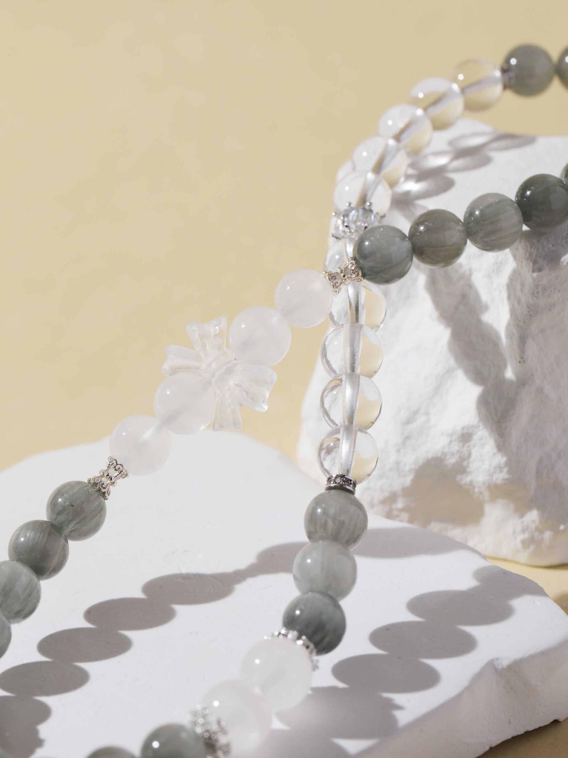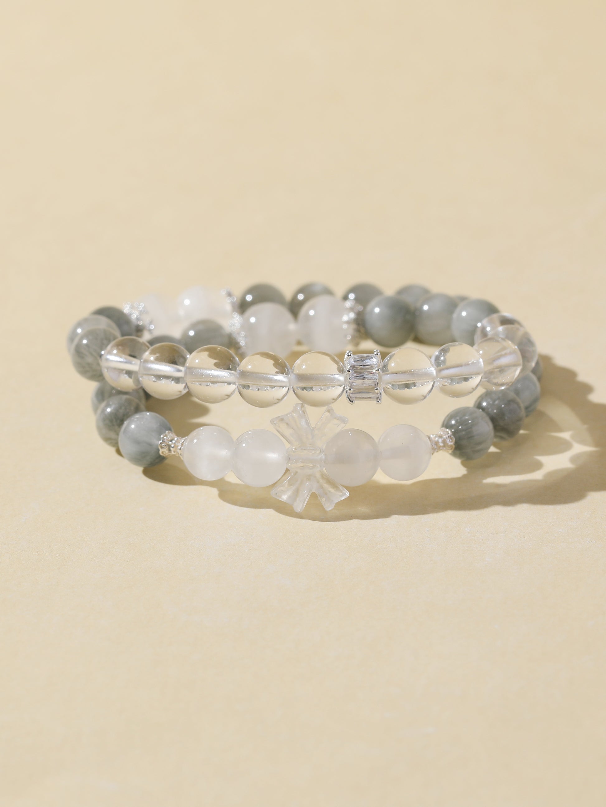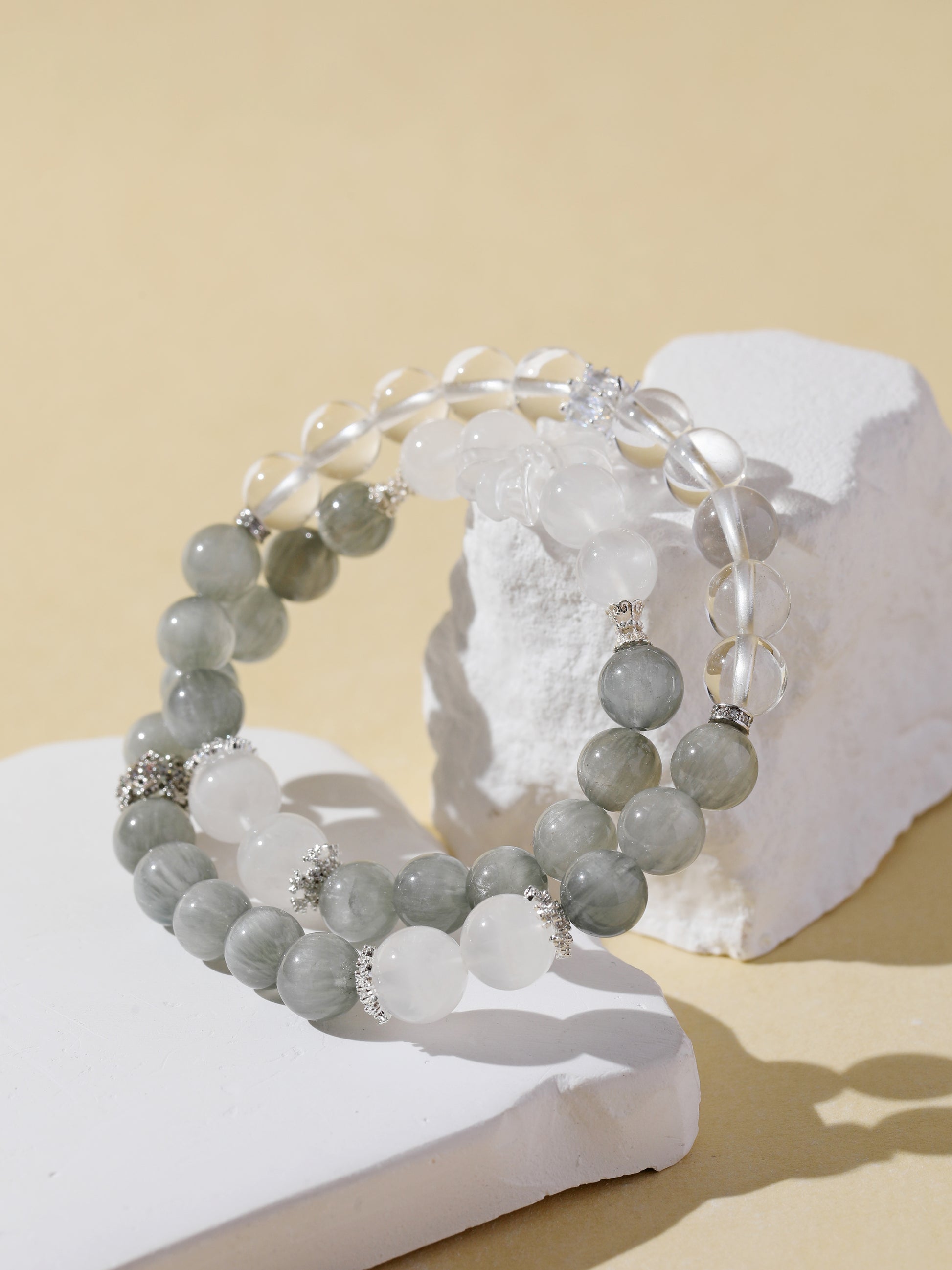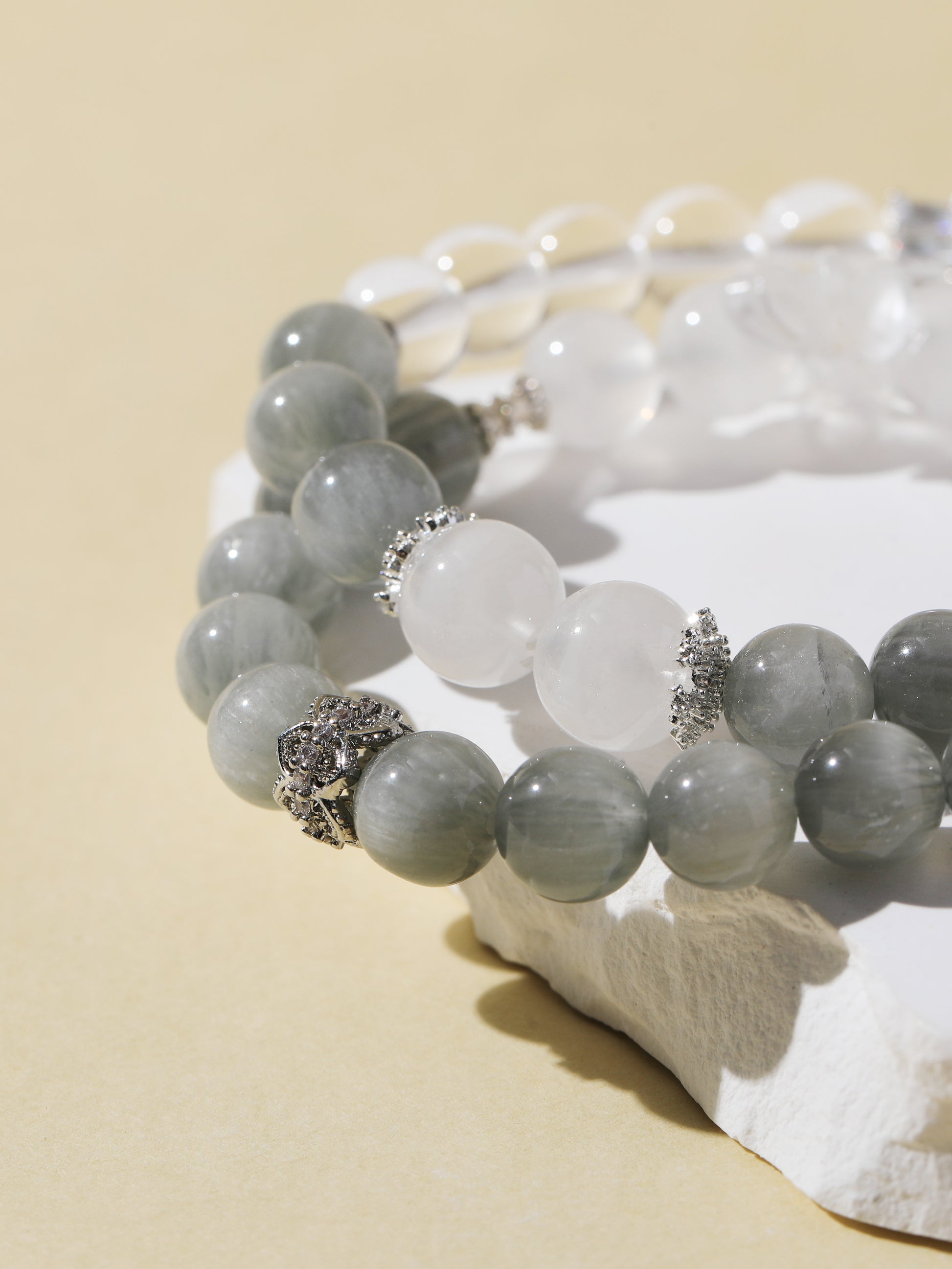 Double-Wrap Grey Hair Quartz & White Cat’s Eye & Clear Quartz Bracelet
