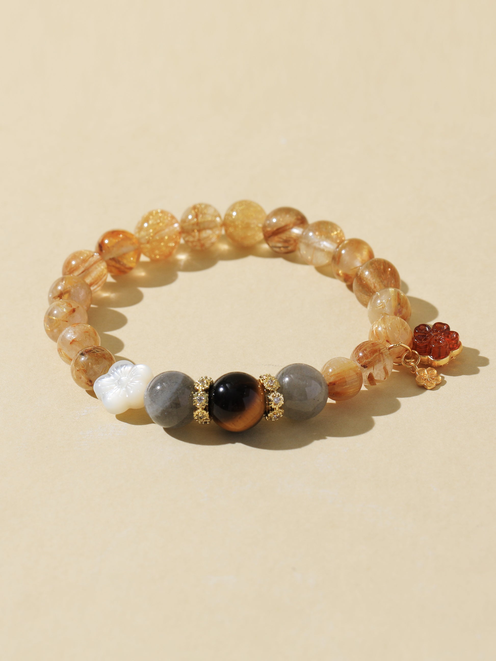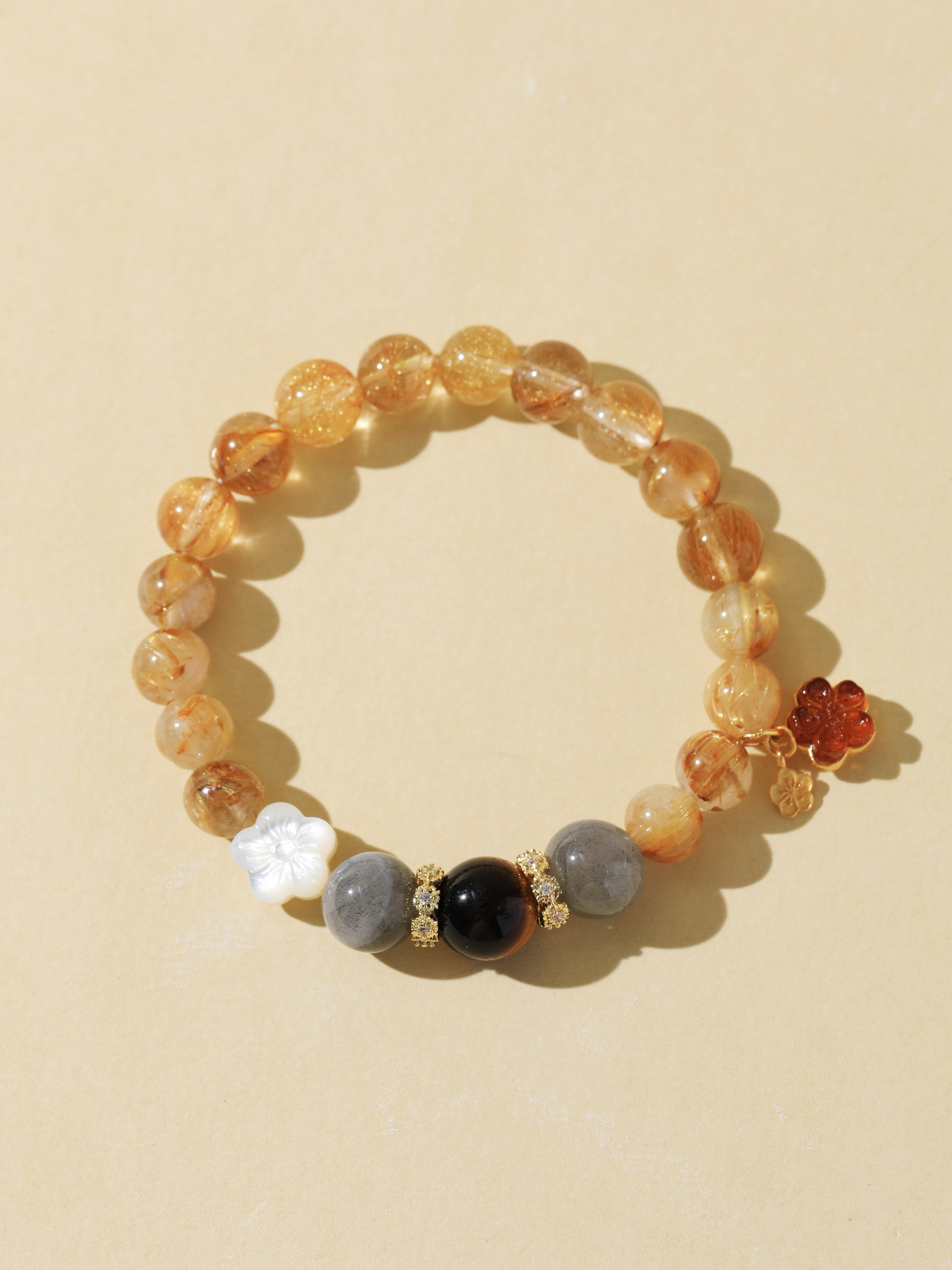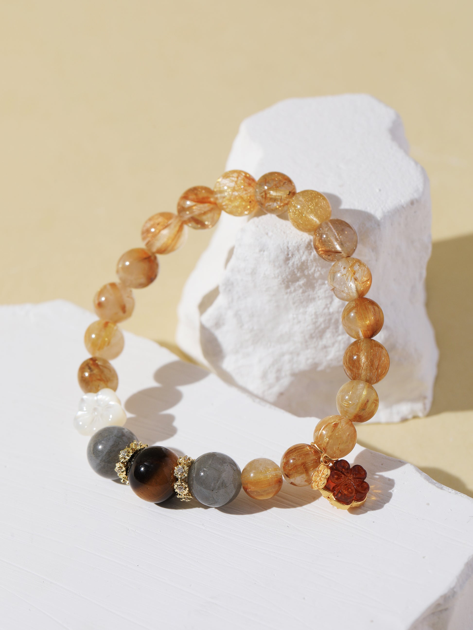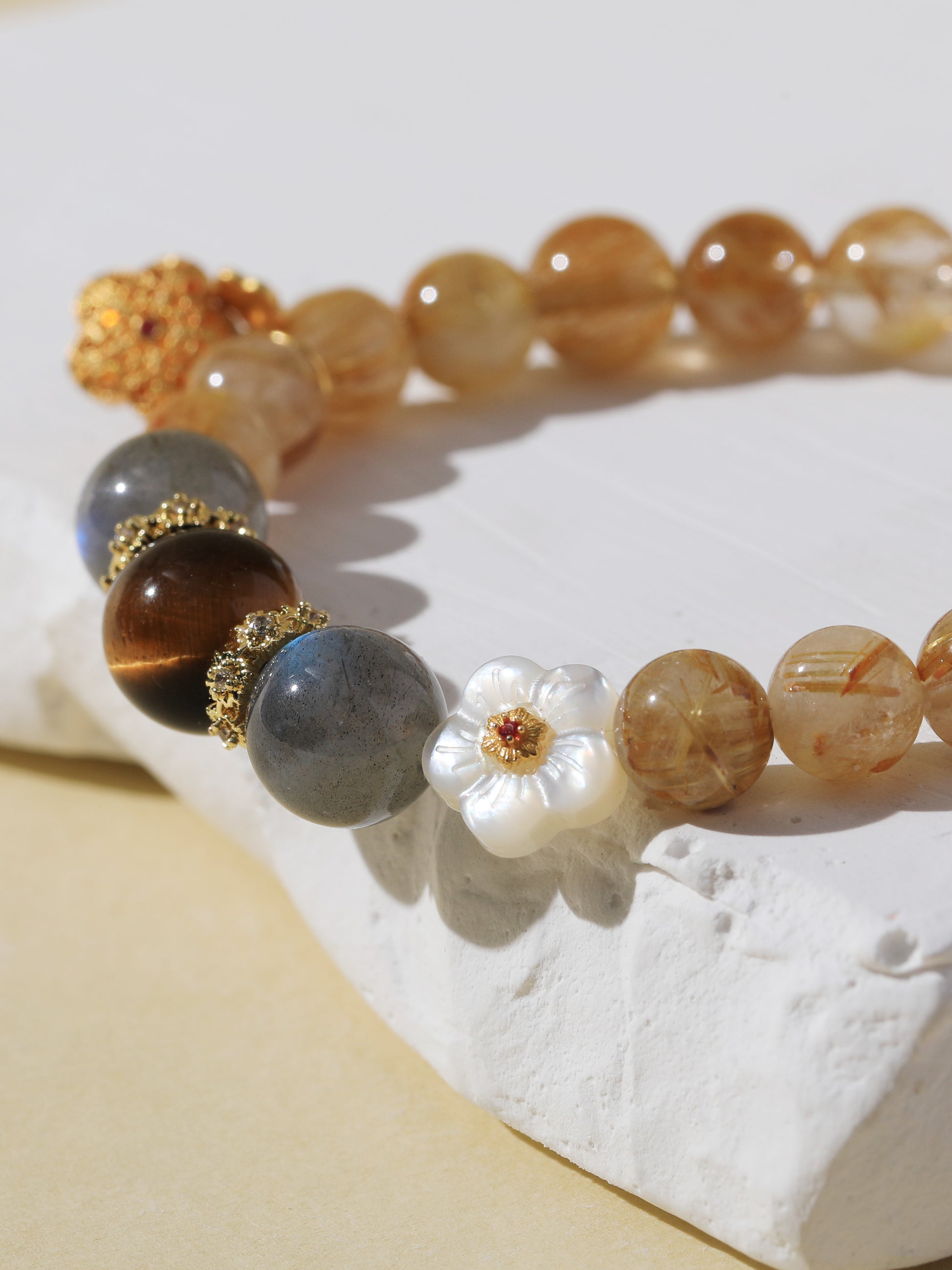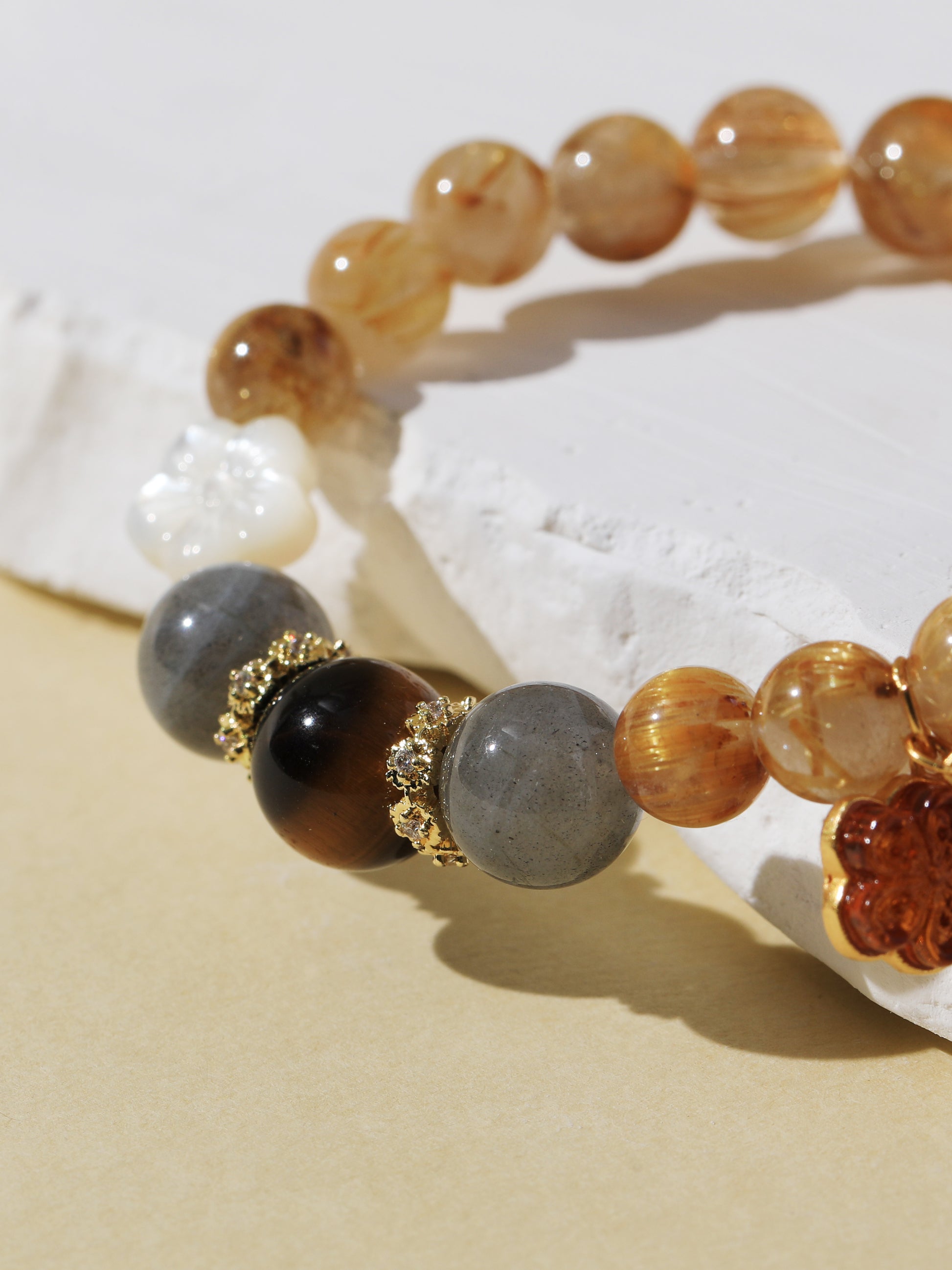 Golden Rutilated Quartz, Black Tiger’s Eye & Grey Moonstone Bracelet