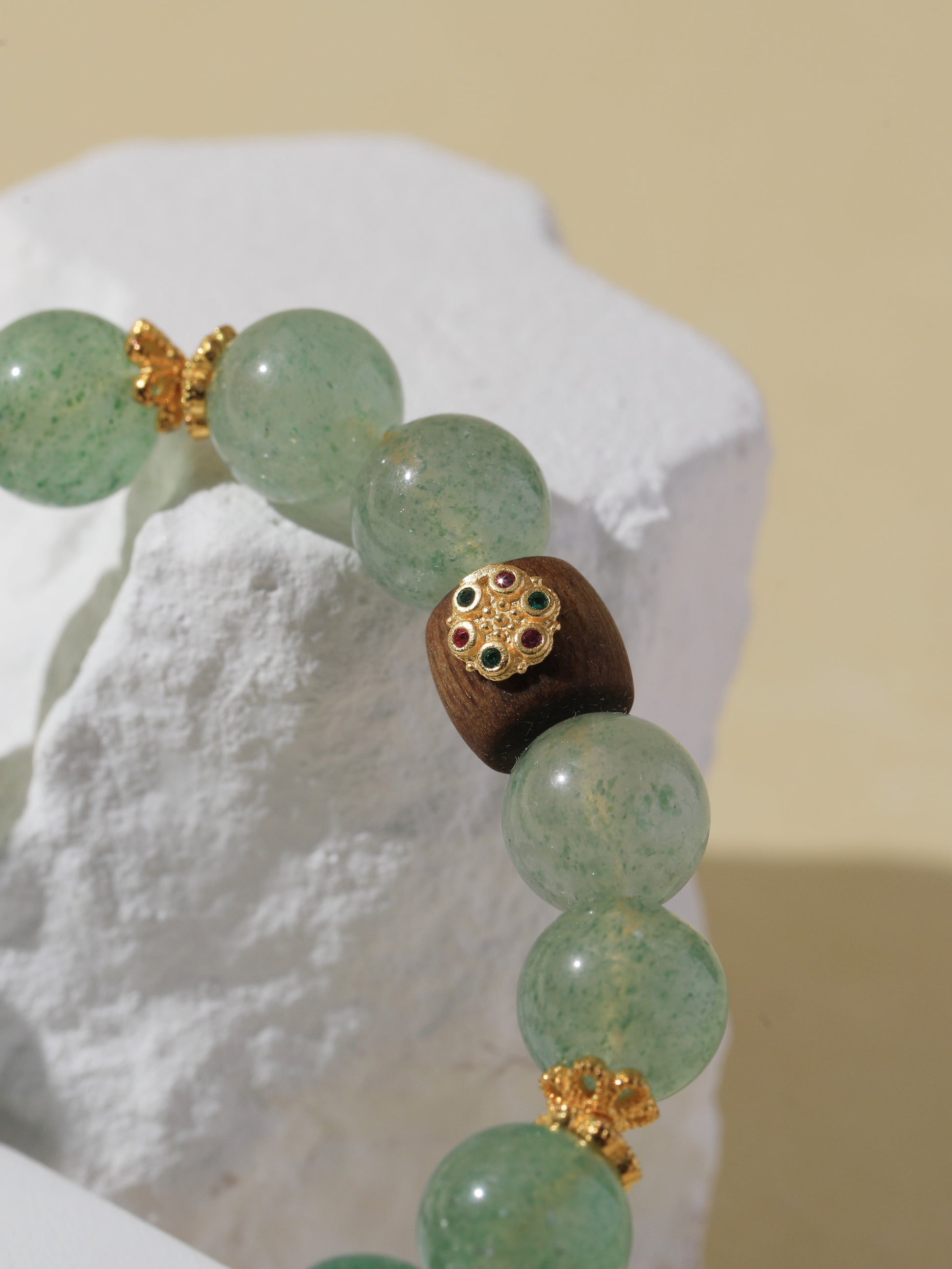 Green Quartz is associated with growth, clarity, and emotional renewal. It promotes a gentle flow of energy that soothes the heart and mind. Agarwood, prized in Eastern traditions, offers grounding and purification, enhancing your sense of inner peace and spiritual protection. This bracelet pairs 9.5mm gradient Green Quartz with a natural Agarwood bead and gold-tone accents, blending fresh green tones with the warmth of wood in an elegant, grounding design.