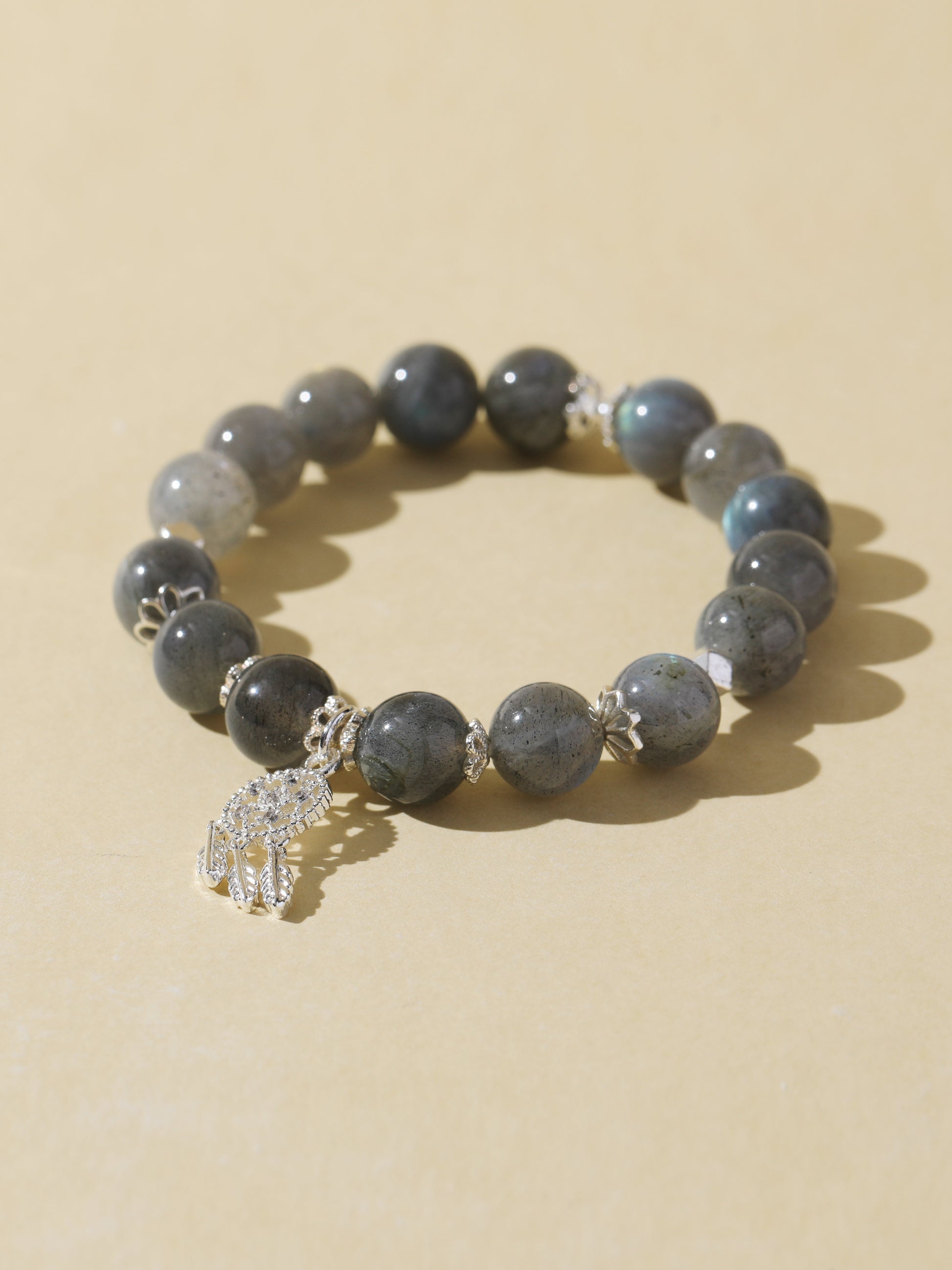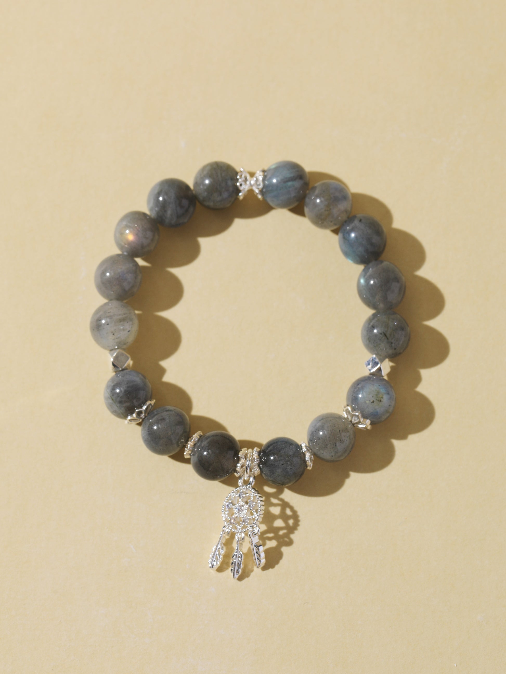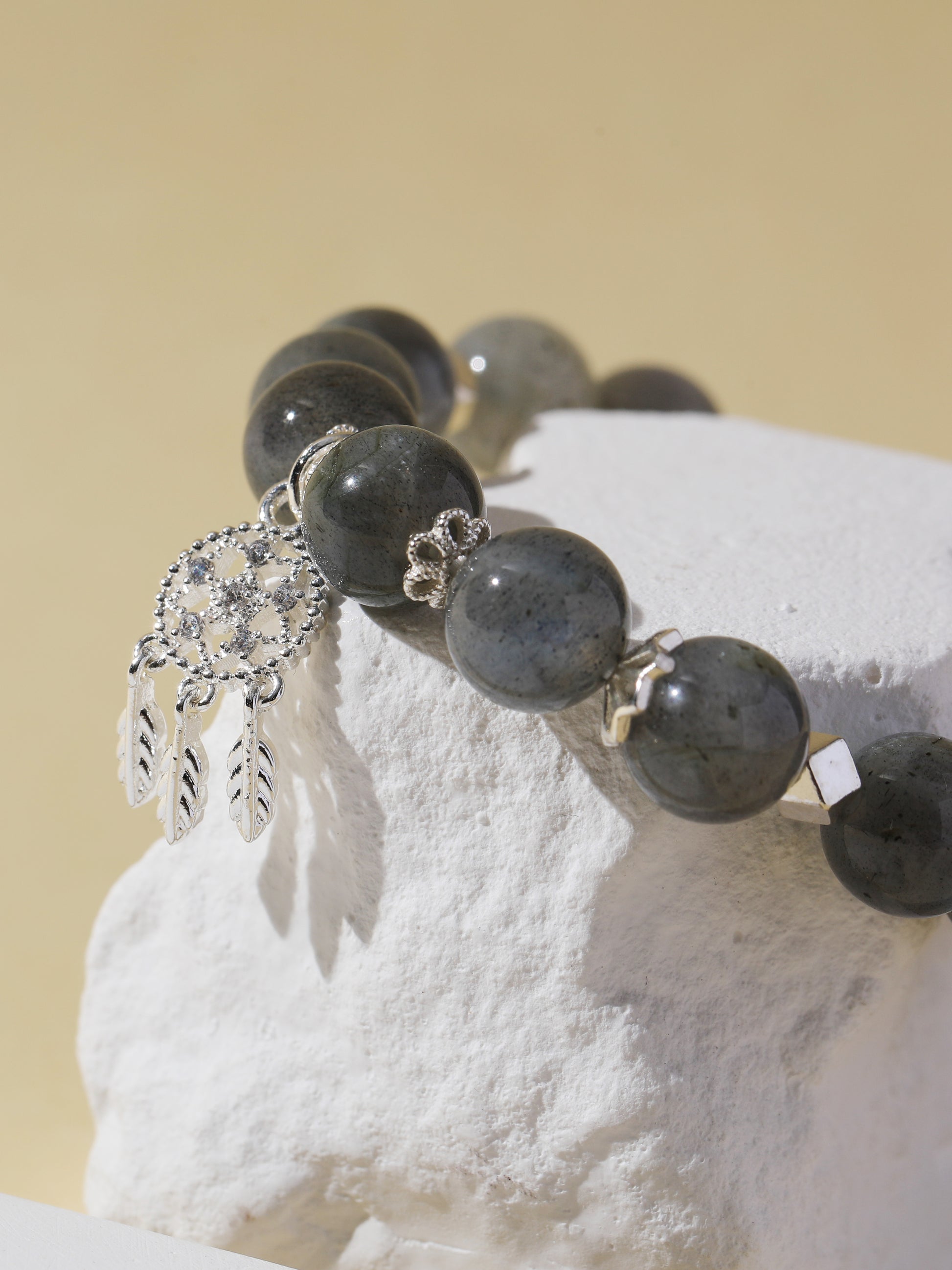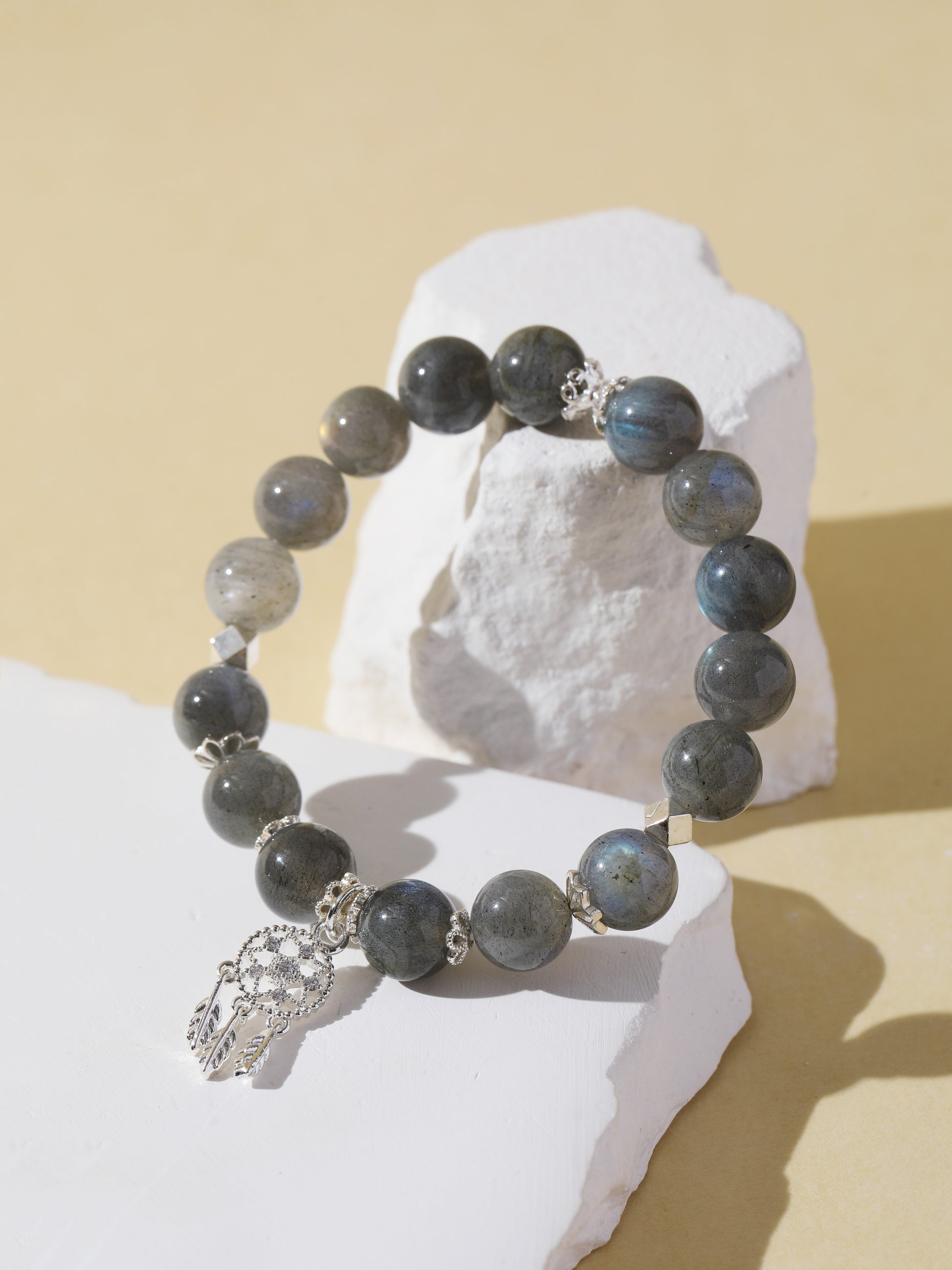 Grey Moonstone is a mystical stone of intuition and emotional balance. Often linked with the moon and dreams, it soothes anxiety, supports restful reflection, and enhances inner awareness—especially during times of transition or quiet introspection. This bracelet features 9mm Grey Moonstone beads, accented by a silver dreamcatcher charm and silver-toned details.