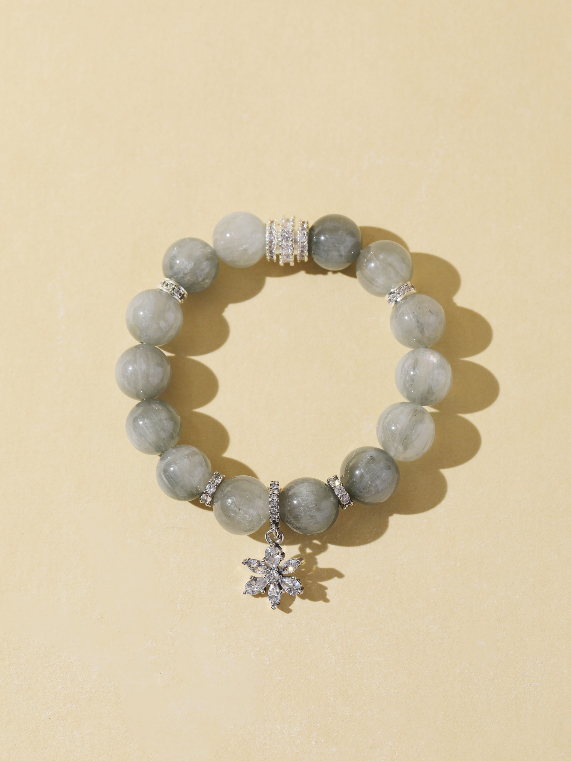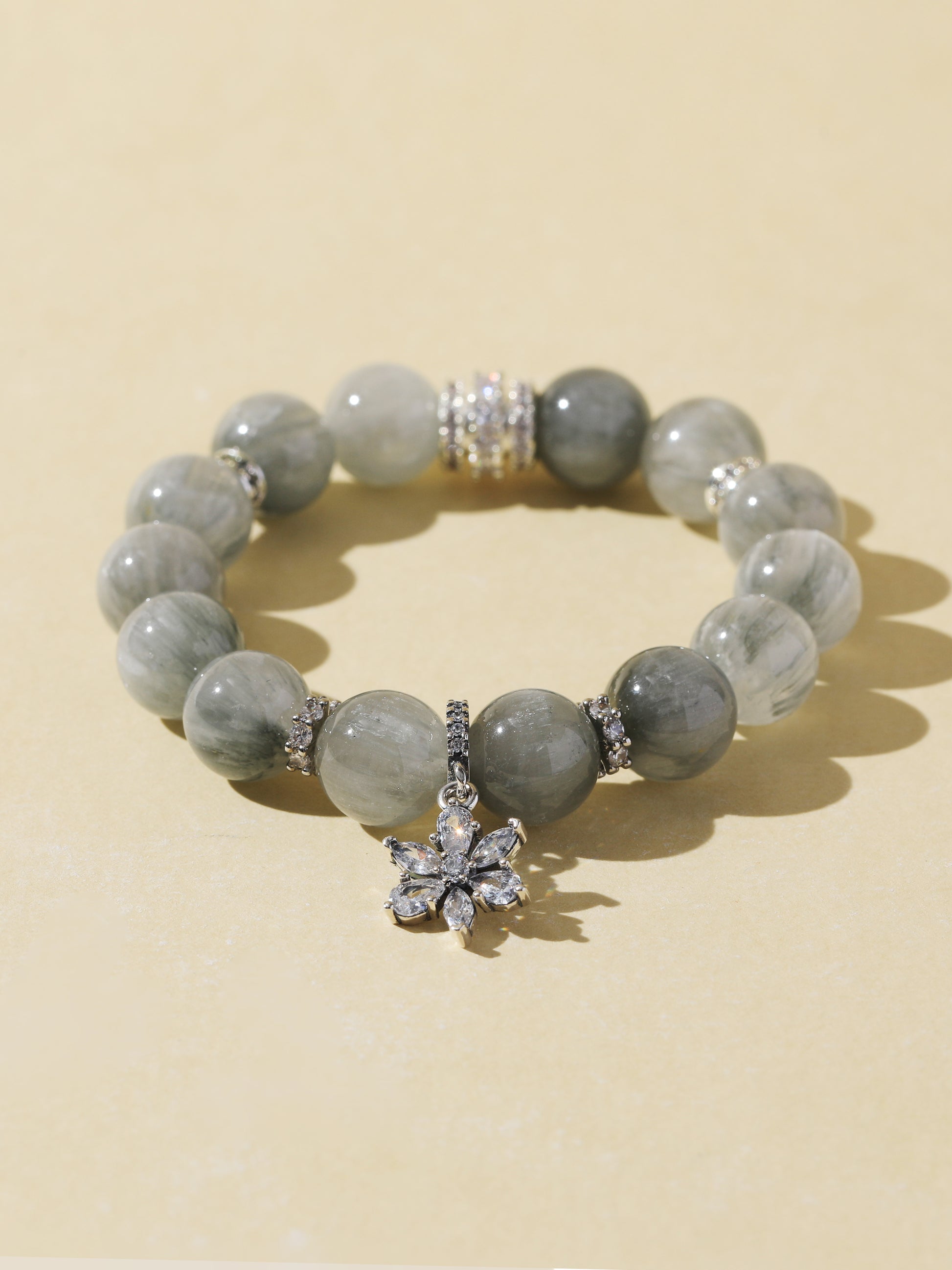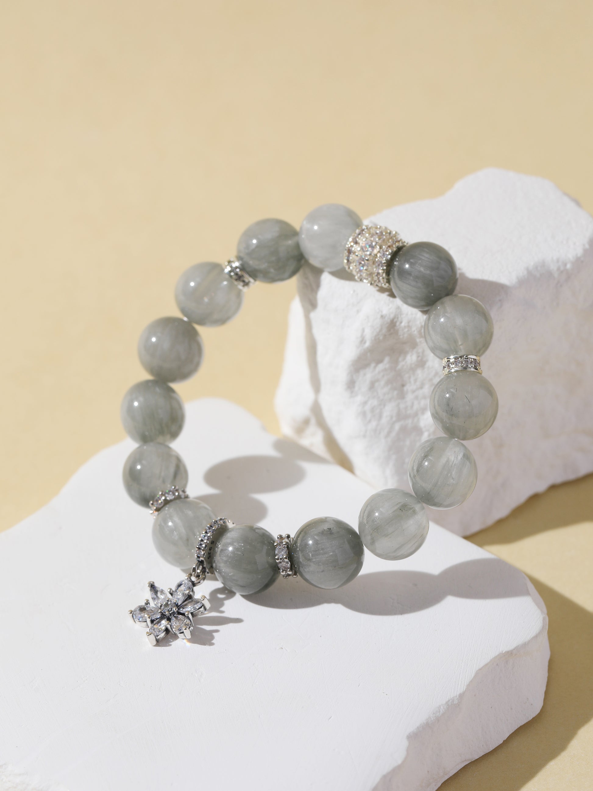Grey Rabbit Hair Quartz is known for its calming and harmonizing energy. It helps ease emotional stress, promotes clarity, and supports inner peace. This bracelet features 11mm Grey Rabbit Hair Quartz beads, accented with a silver snowflake charm. With its soft tone and natural silky texture, it’s a subtle yet graceful piece for everyday wear.