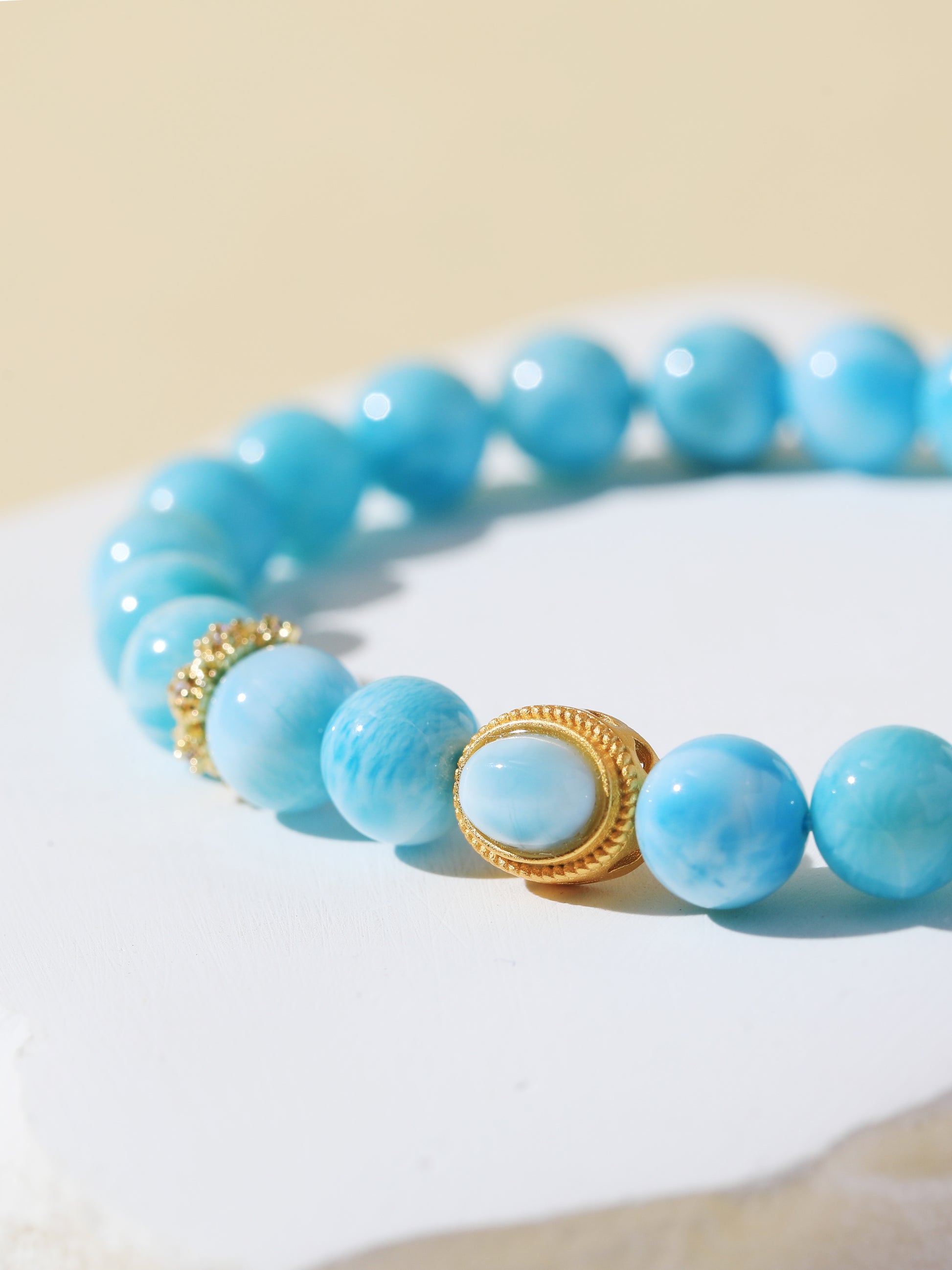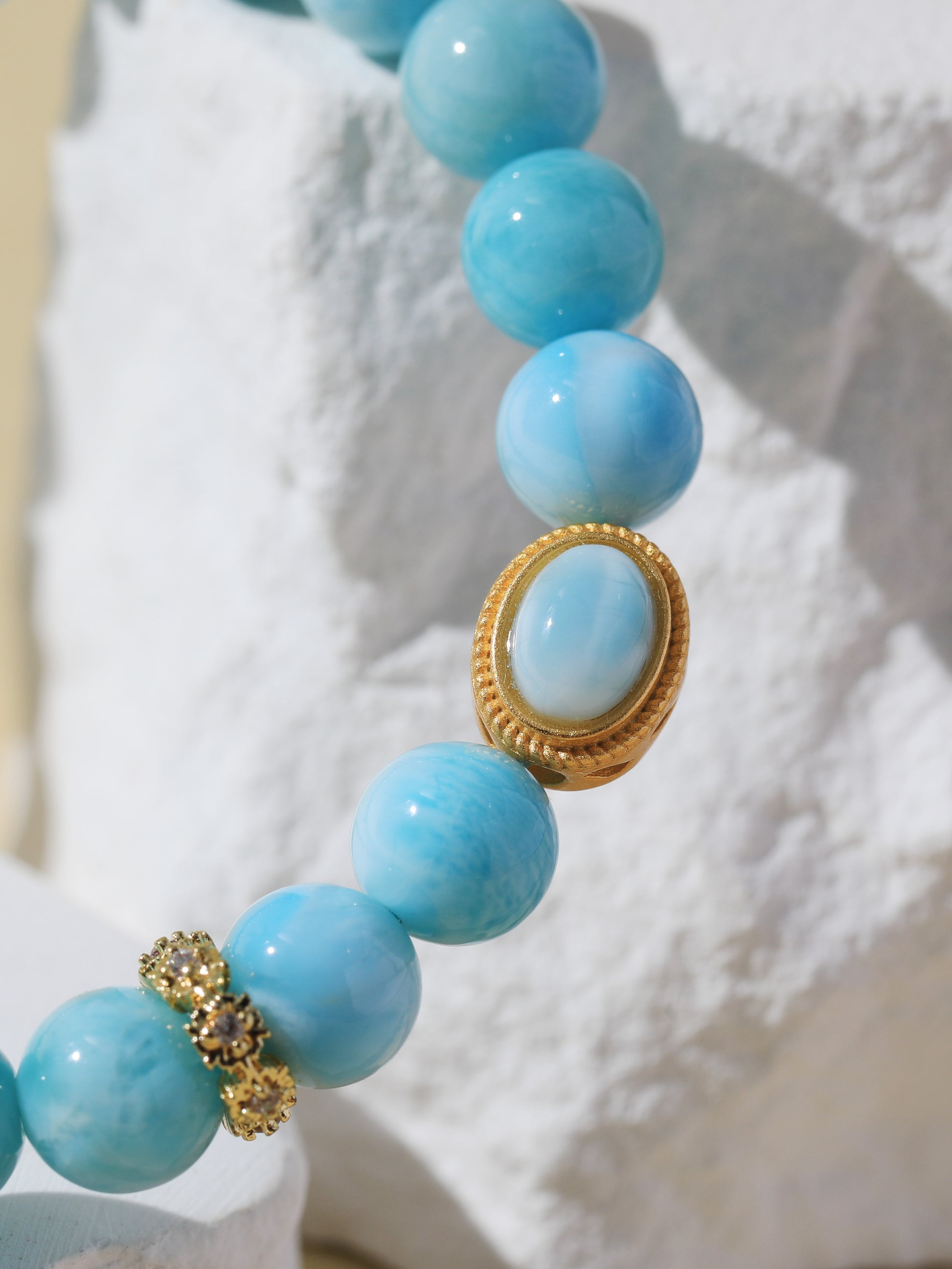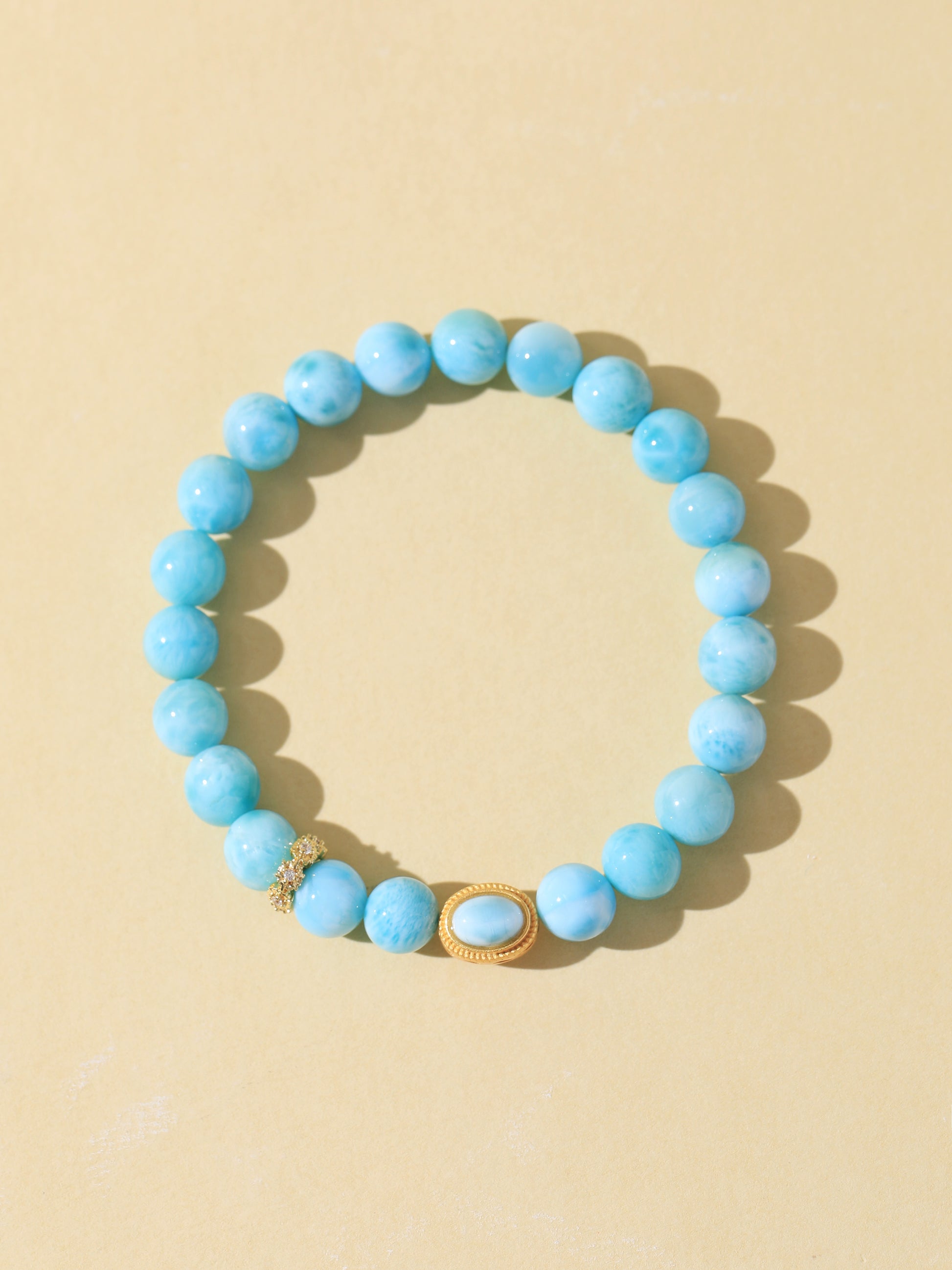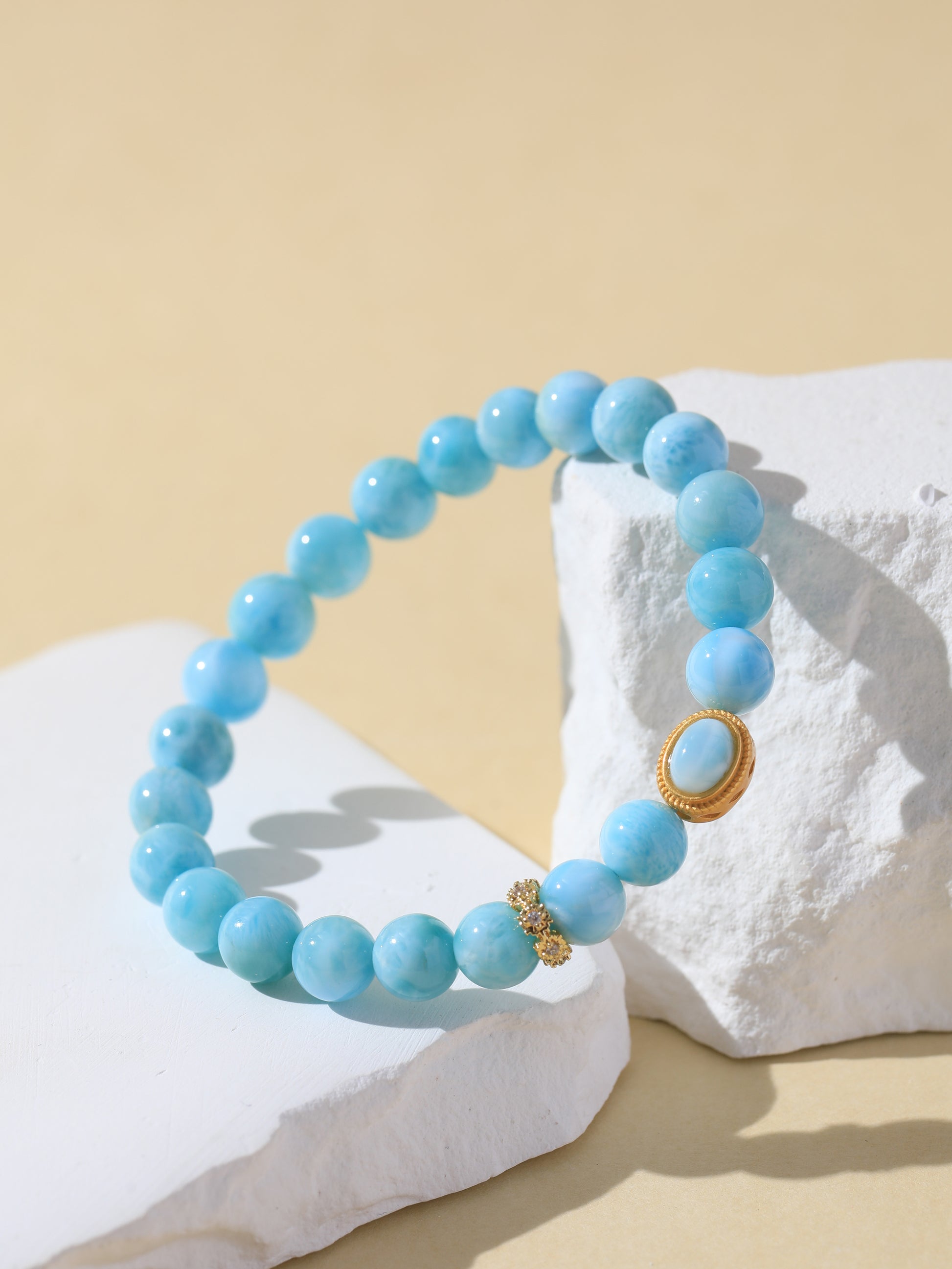 Larimar, known as the “Caribbean Gem,” promotes peace, stress relief, and emotional healing with its gentle sea-blue color. This bracelet is crafted with 7.5mm natural Larimar beads, highlighted by a gold-framed oval focal stone and a gold-tone spacer. It evokes the soothing rhythm of the ocean, offering a refreshing and calming presence for daily wear.