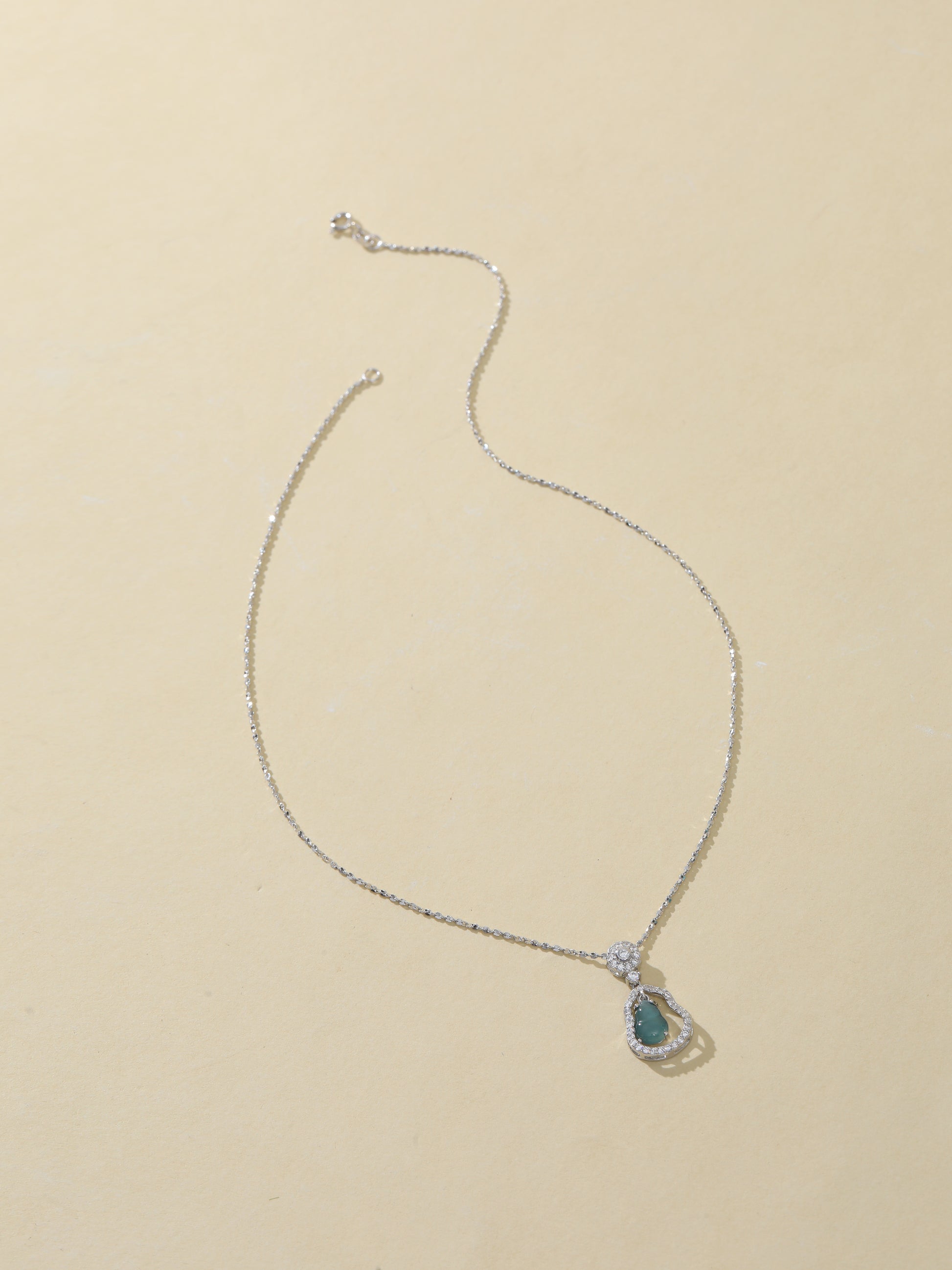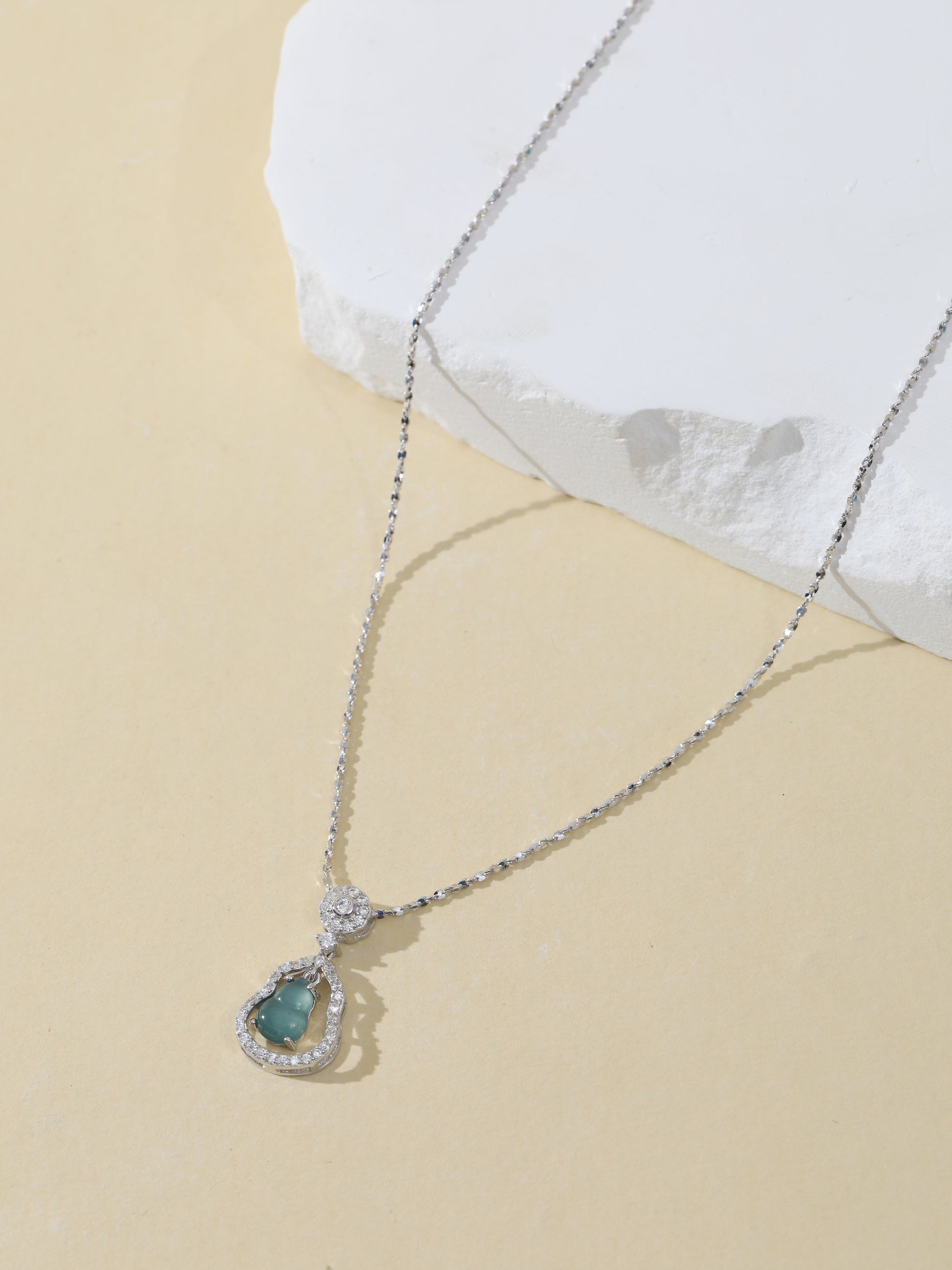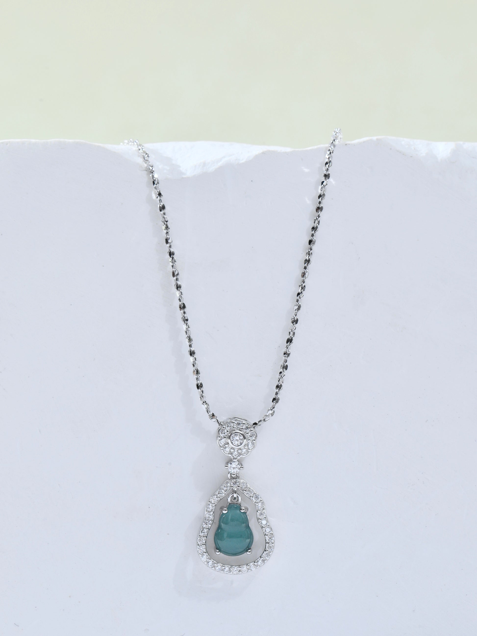 This necklace features a gourd-shaped pendant delicately carved from natural blue water jade sourced from Guatemala. The translucent bluish-green jade is set in a sparkling S925 sterling silver frame accented with cubic zirconia. In traditional culture, the gourd (hulu) symbolizes protection, prosperity, and harmony — making this a meaningful accessory for everyday wear or gifting.