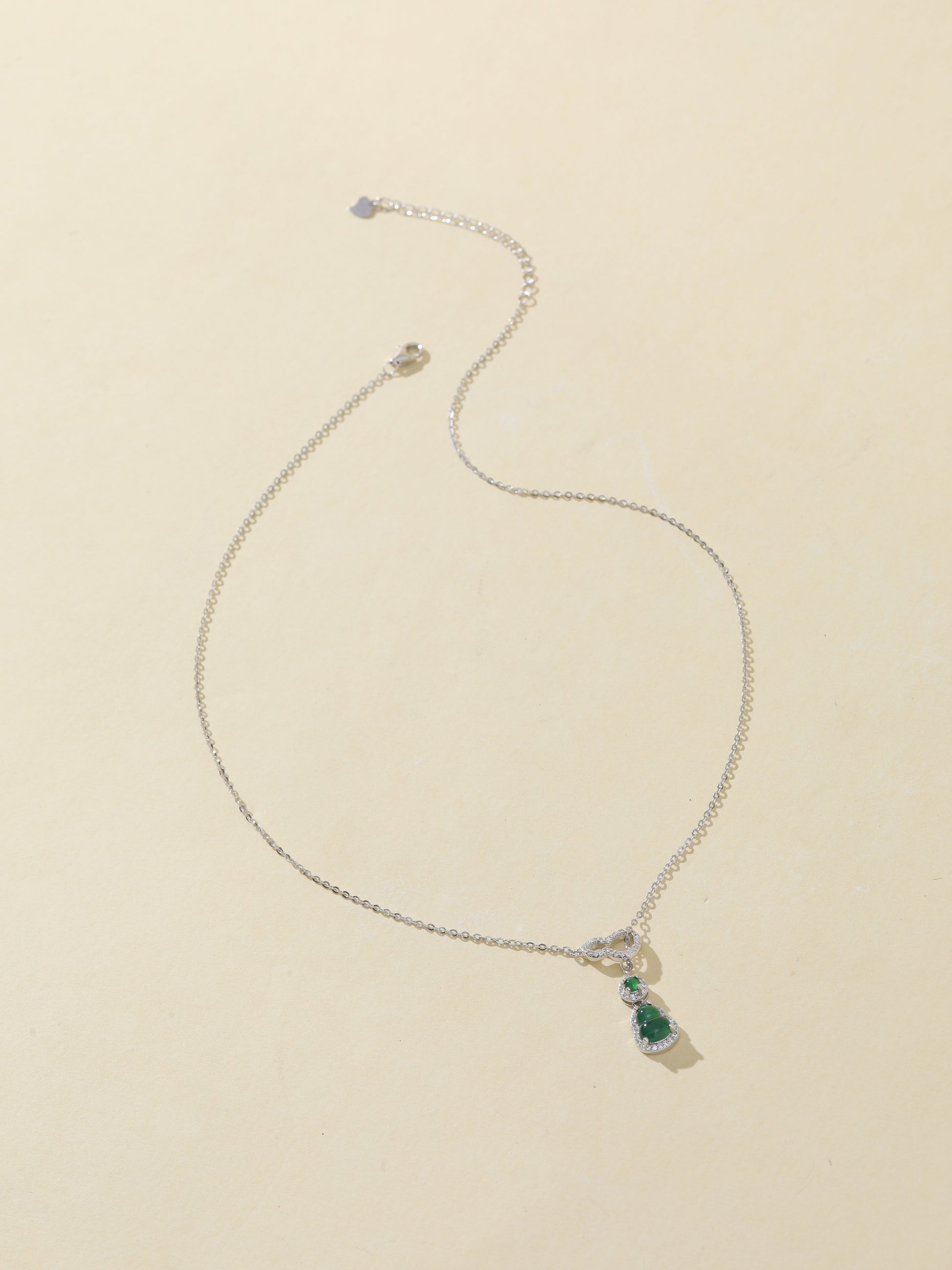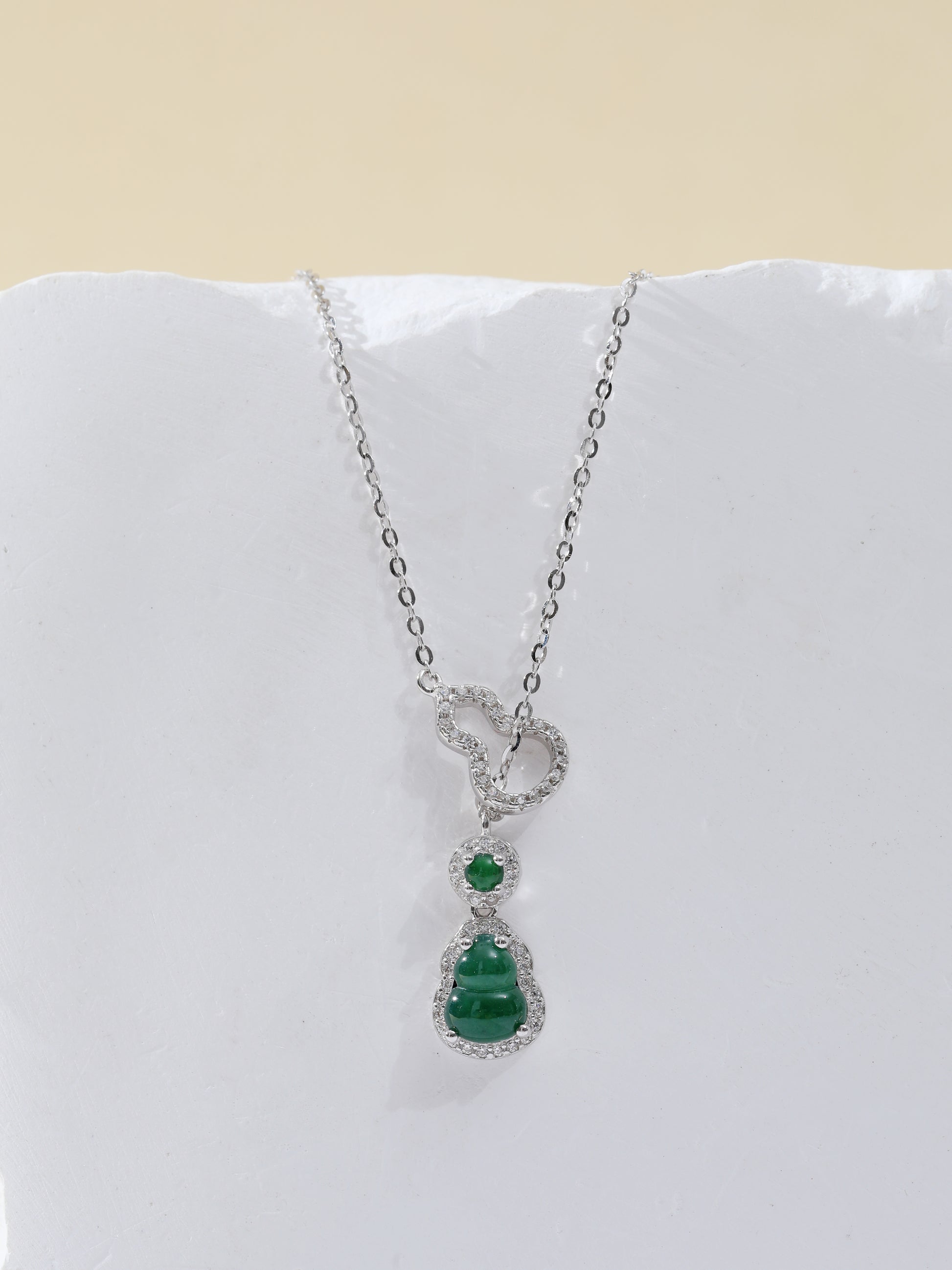 This necklace features a beautifully carved gourd pendant made from natural imperial green jade sourced from Guatemala. Set in a shimmering S925 sterling silver frame, the pendant is further accented with a smaller jade stone and pavé zircon details. The gourd (hulu) symbolizes protection, good fortune, and well-being in Chinese culture.