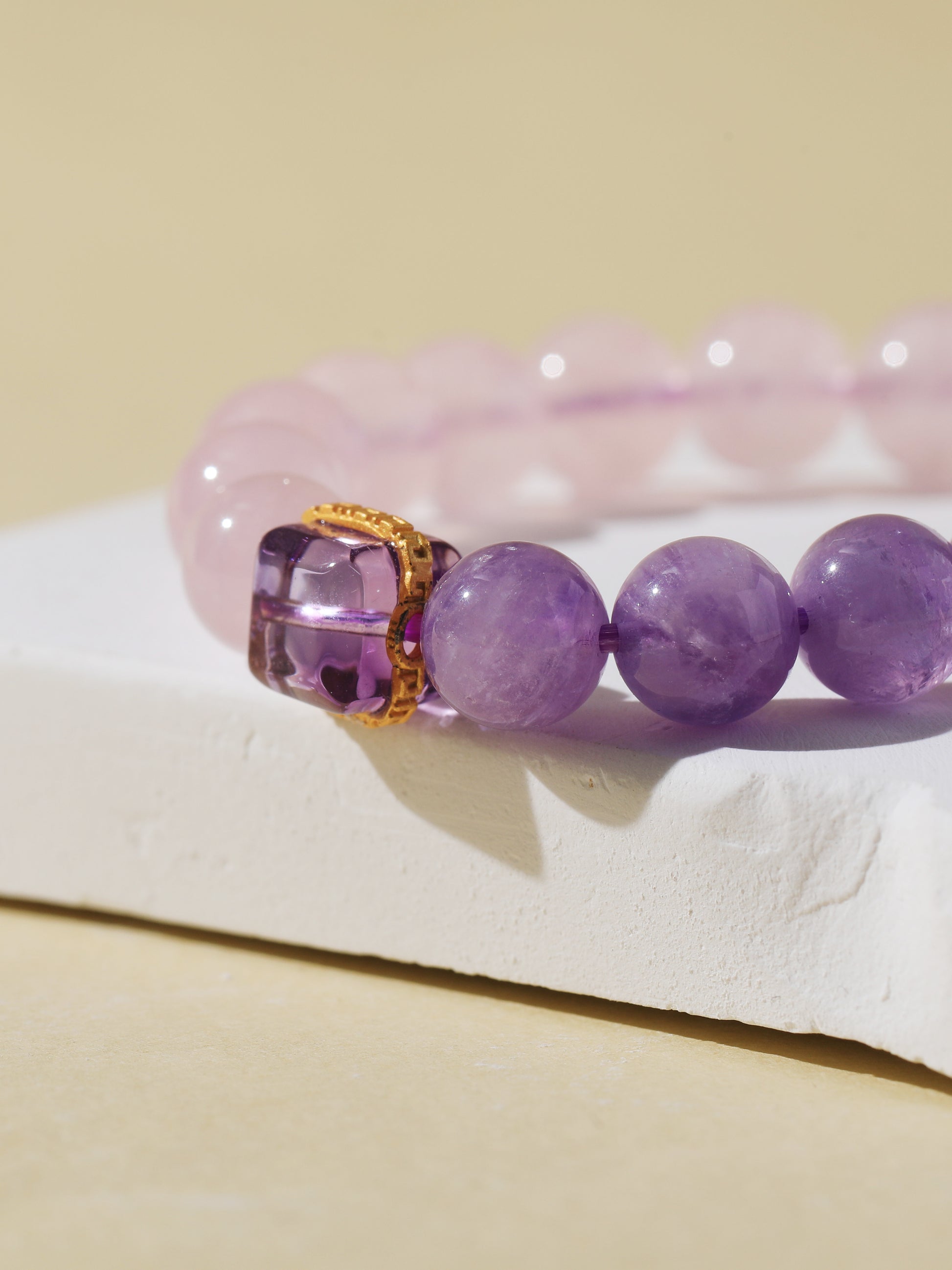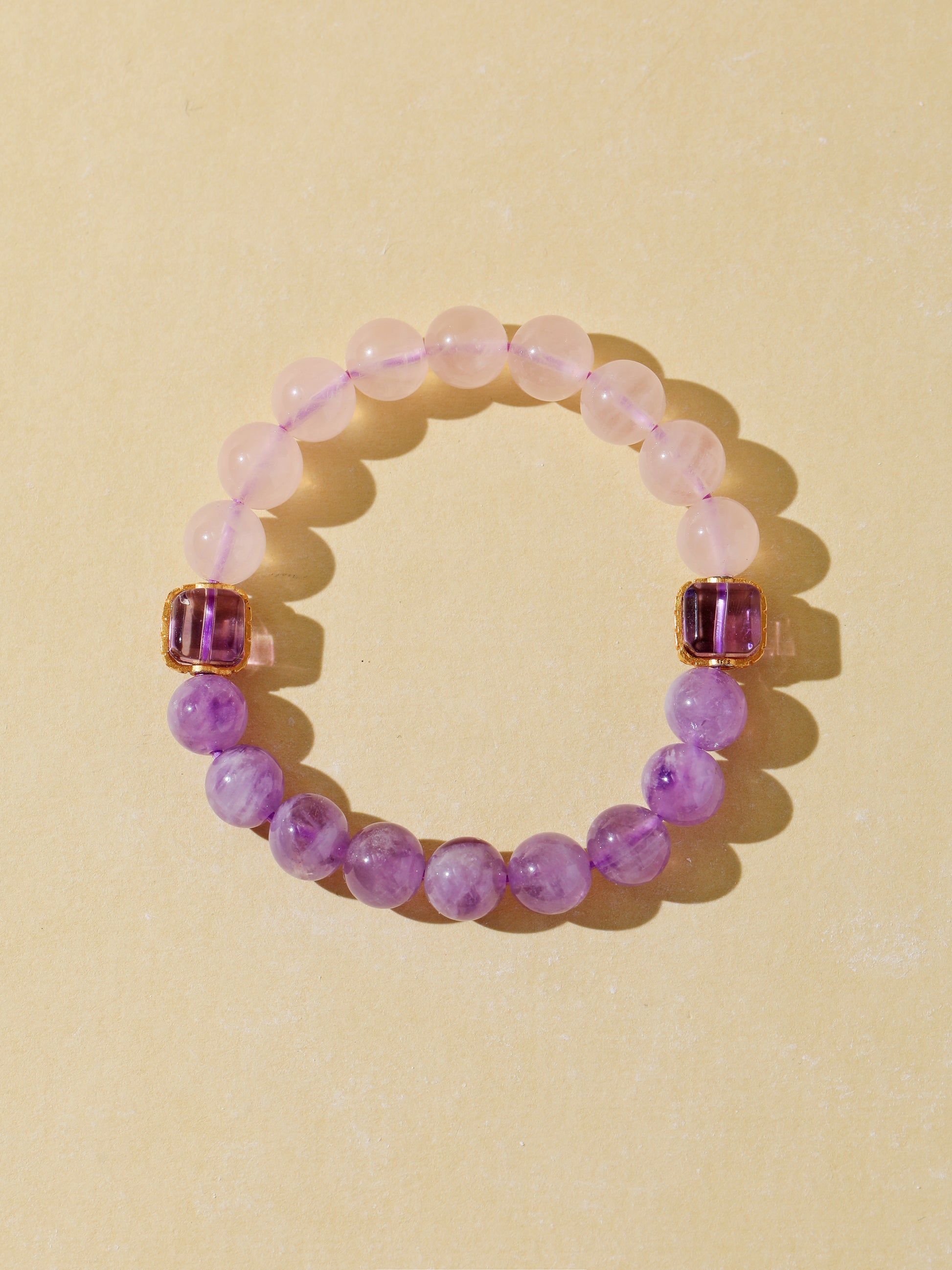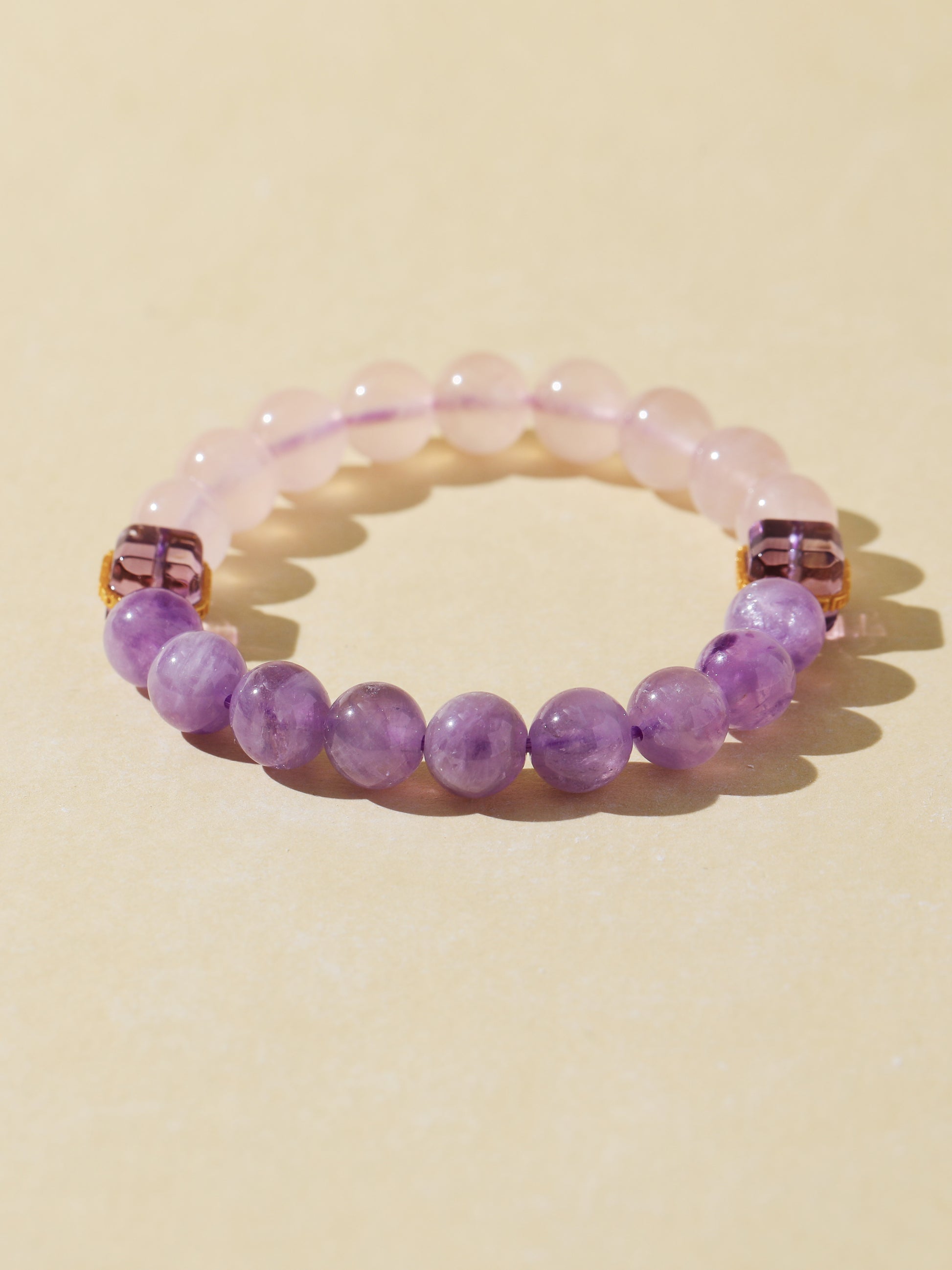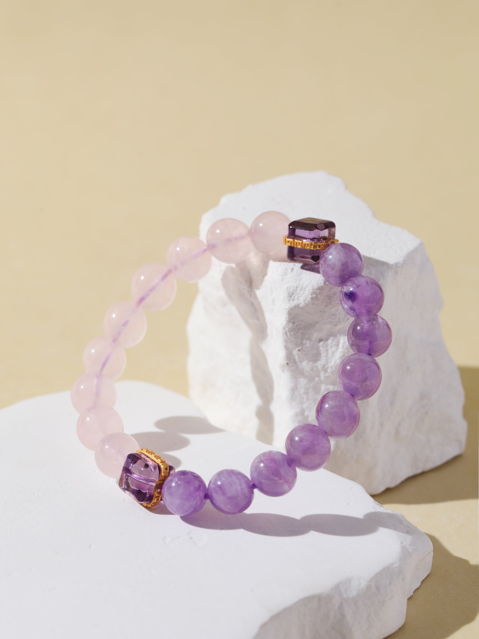 Purple Rabbit Hair Quartz enhances intuitive flow and emotional release, while Rose Quartz opens the heart to self-love and connection. Together, they create a soft, healing energy that brings clarity and calm. This bracelet features a gentle pink-to-purple gradient, accented with violet square charms—lightweight, dreamy, and full of sweet intention.